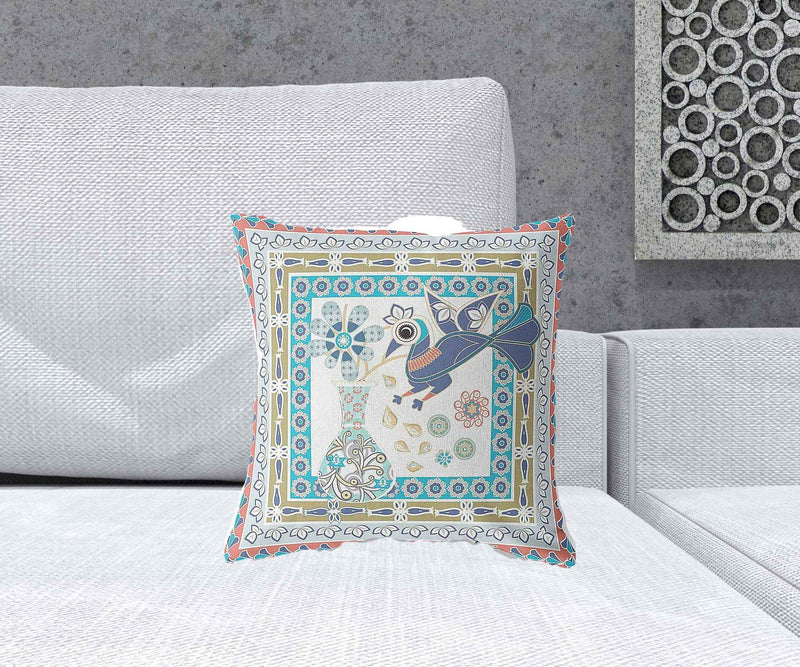 16" x 16" Light Green Peacock Blown Seam Floral Indoor Outdoor Throw Pillow