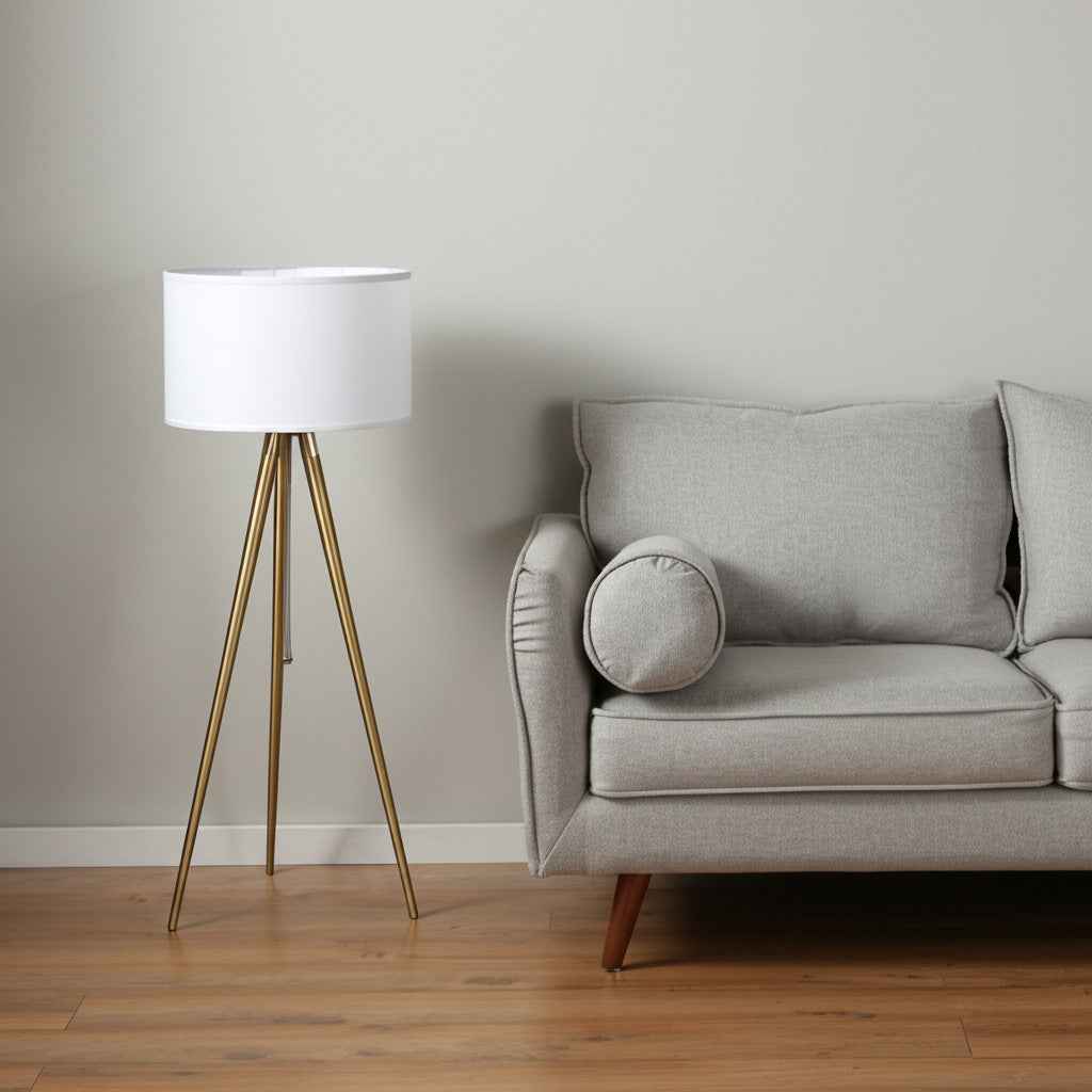 Gold Metal Adjustable Tripod Floor Lamp With White Linen Drum Shade