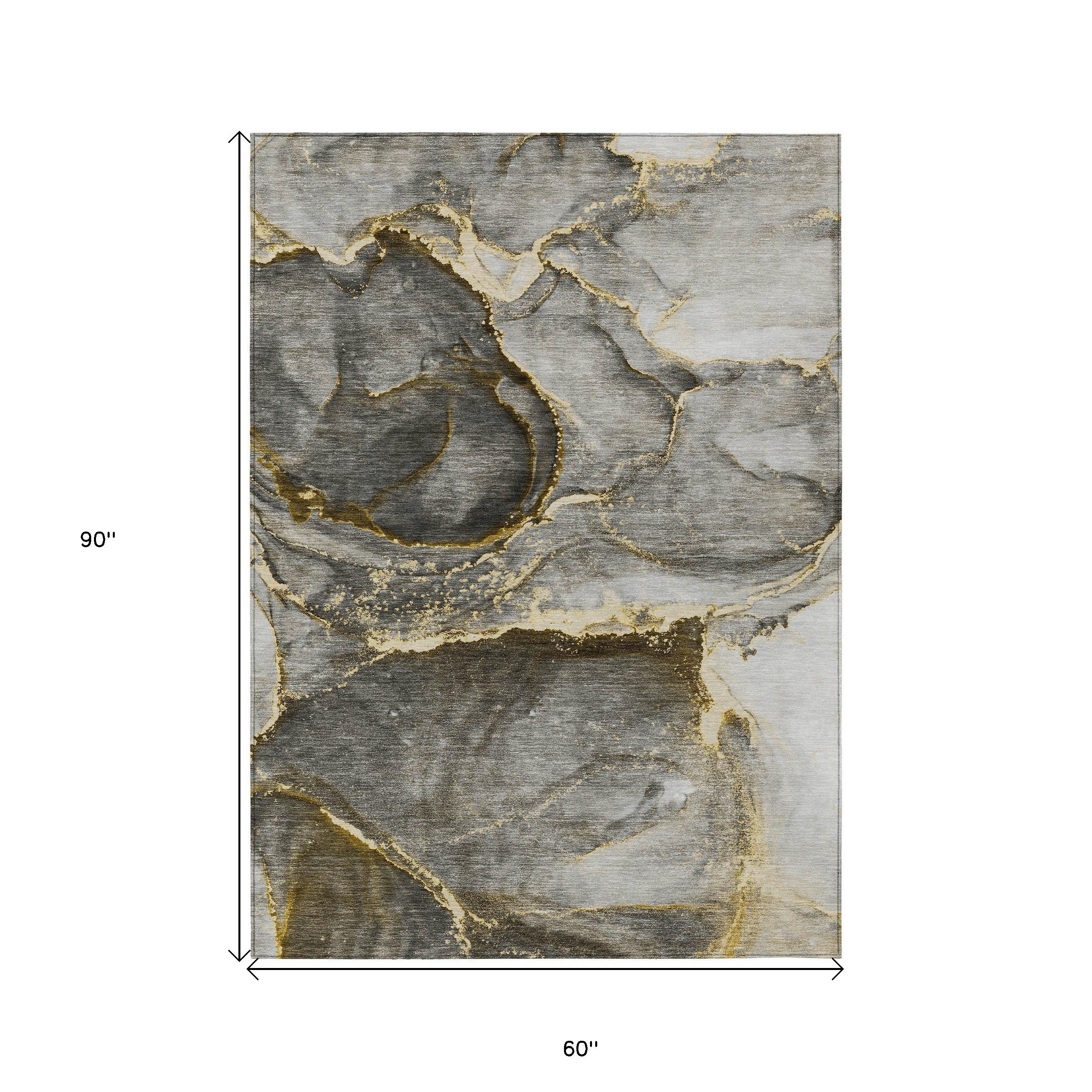 5' X 8' Gray and Gold Abstract Washable Non Skid Indoor Outdoor Area Rug