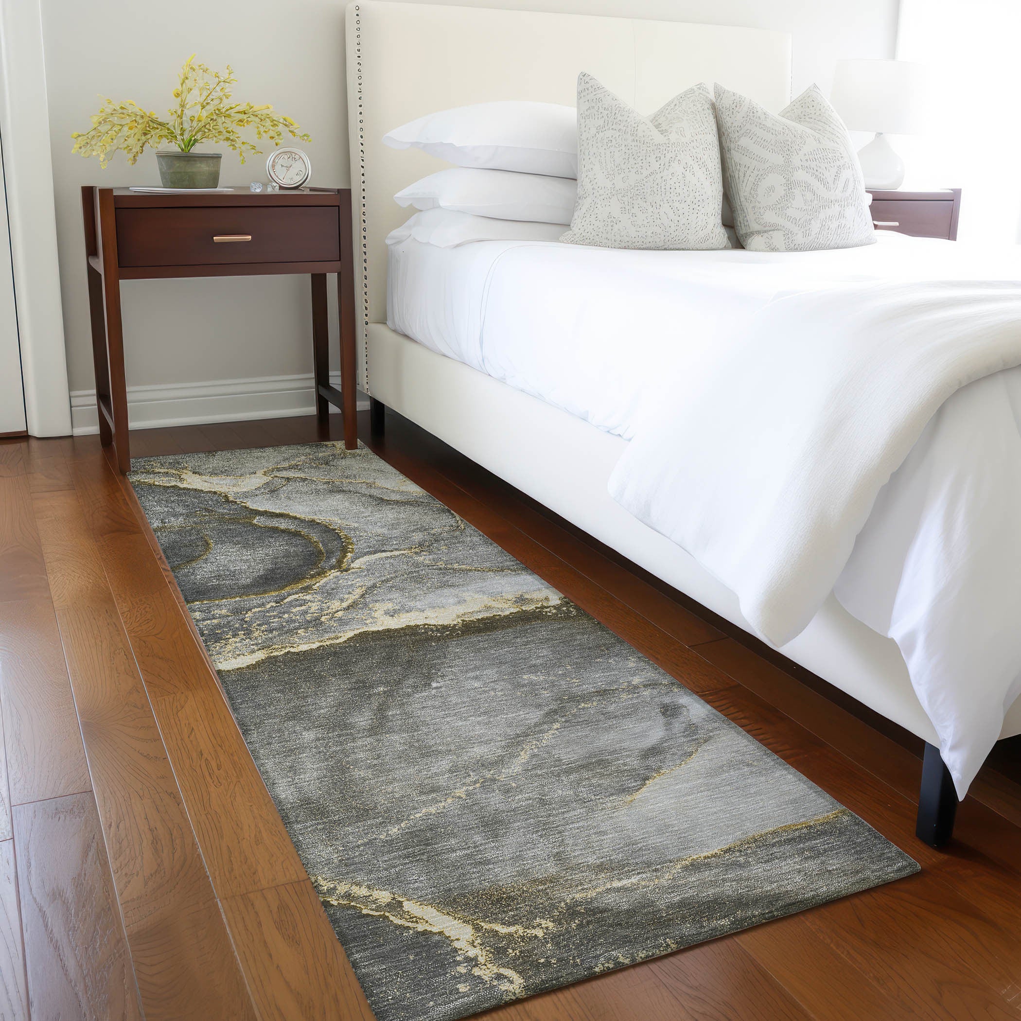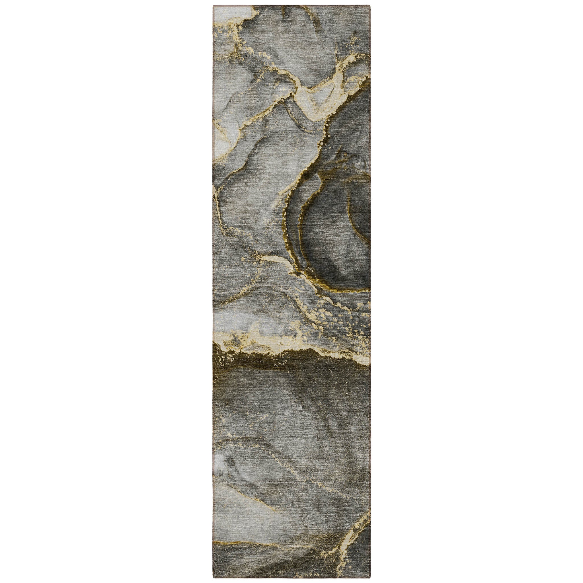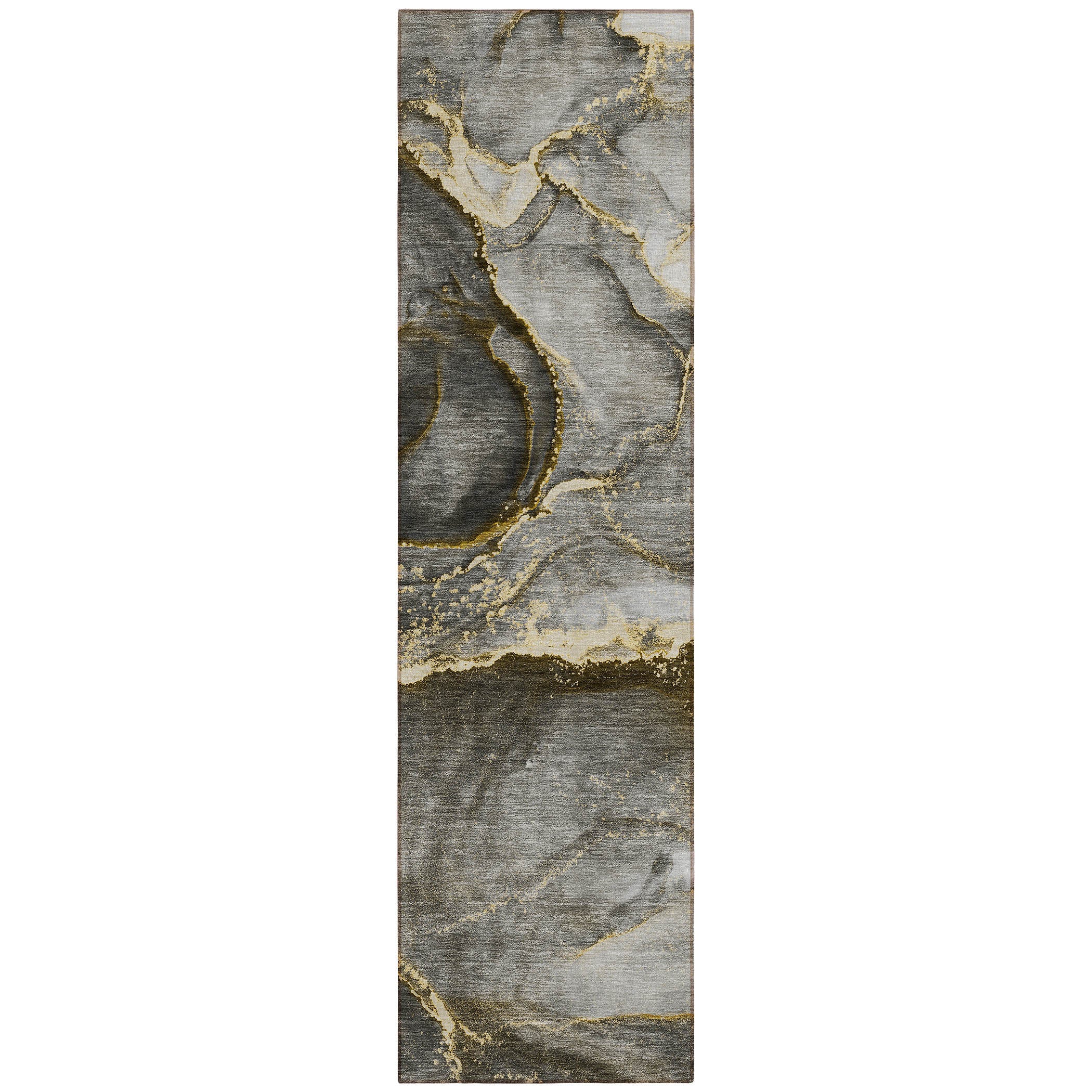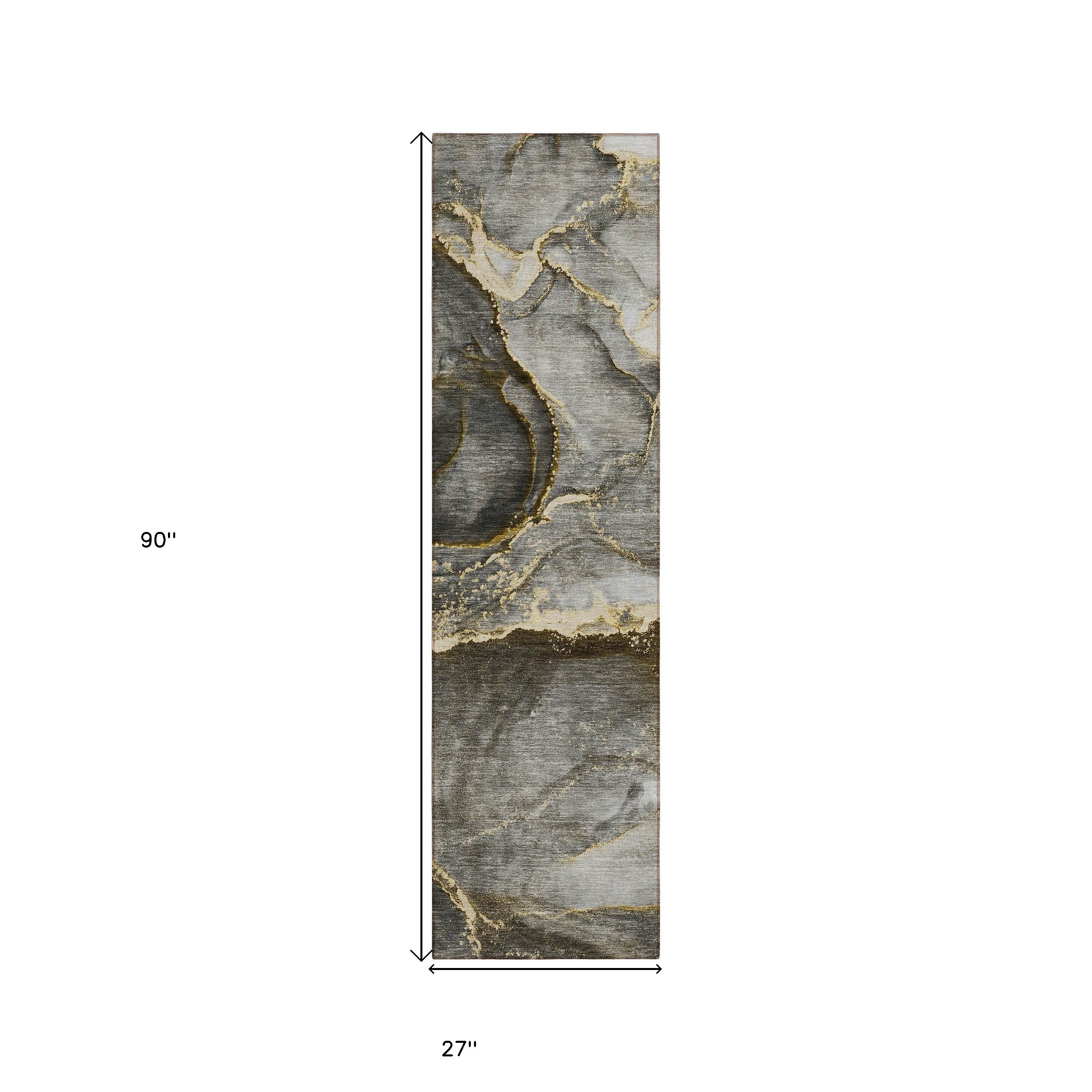 8' Runner Gray and Gold Abstract Washable Non Skid Indoor Outdoor Runner Rug