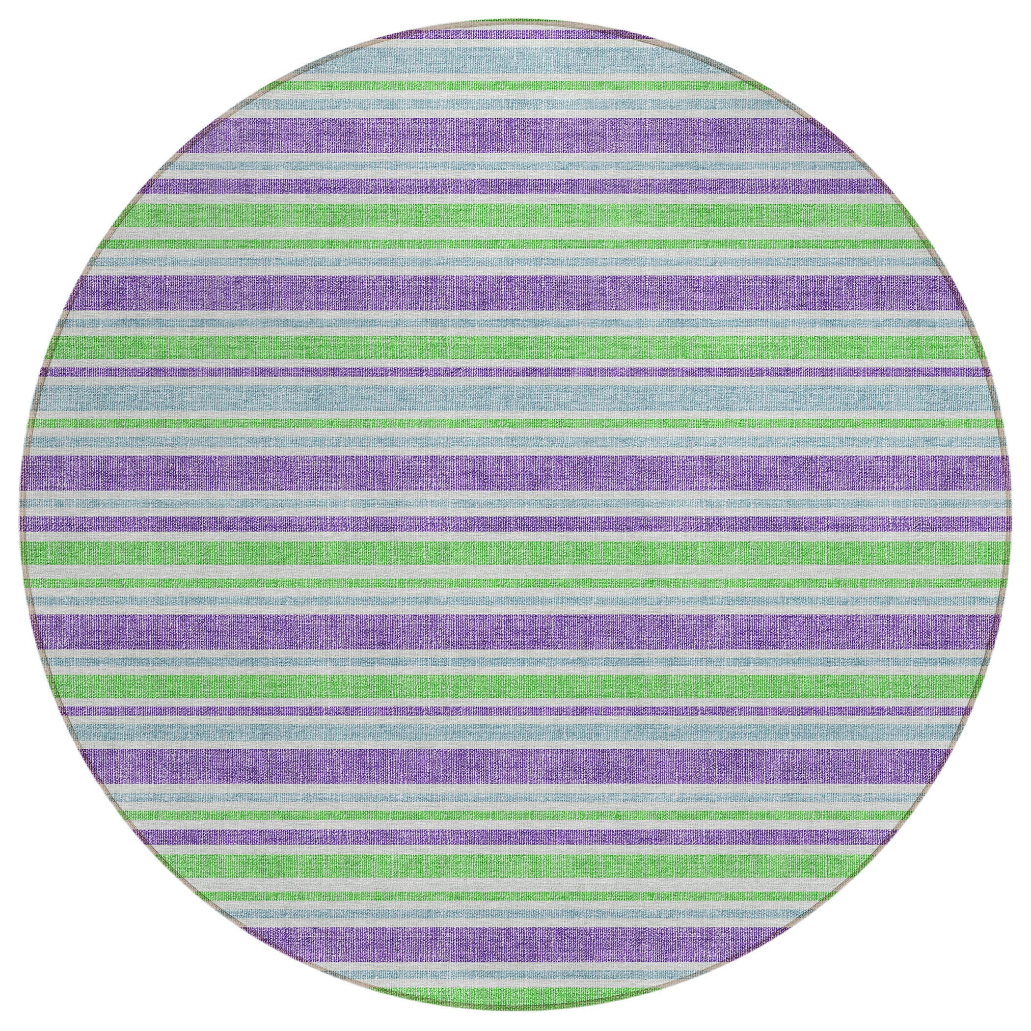 Set an inviting tone in your space with this 8-foot x 8-foot green purple and blue round striped washable non skid indoor outdoor area rug. This geometric round shaped rug features a striped pattern in green purple and blue that combines a good looking print with a unique and updated shape. The mix of shape, color, and design gives this rug refreshing visual interest. Ideal for spaces with kids and pets, this rug is stain resistant to help repel stains and spilled liquids. Place this area rug against a hardwood or tile floor and it will enliven your living space with style and sophistication. 96-inch H x 96-inch W x 0.19-inch D