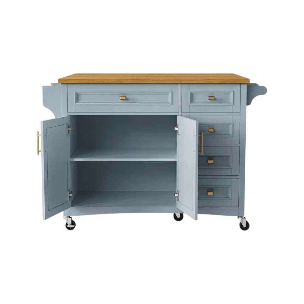 This 52-inch light blue wood rolling kitchen island marks the beginning of a new era for kitchen decor. Made of a combination of durable solid and manufactured wood this rectangular island is a premium organizing solution that provides extra storage and counter space in your kitchen. The beautiful grains and natural variations of the solid wood give this piece its own unique appearance. Utilize the convenient drawers to store your cooking utensils and accessories. Do you ever find yourself searching for more space when meal prepping. This unit includes a drop leaf, which allows you to expand or scale down your counter space. Maximize your space with this multi- functional and good looking kitchen island. 36.25-inch h x 52.00-inch w x 29.50-inch d.