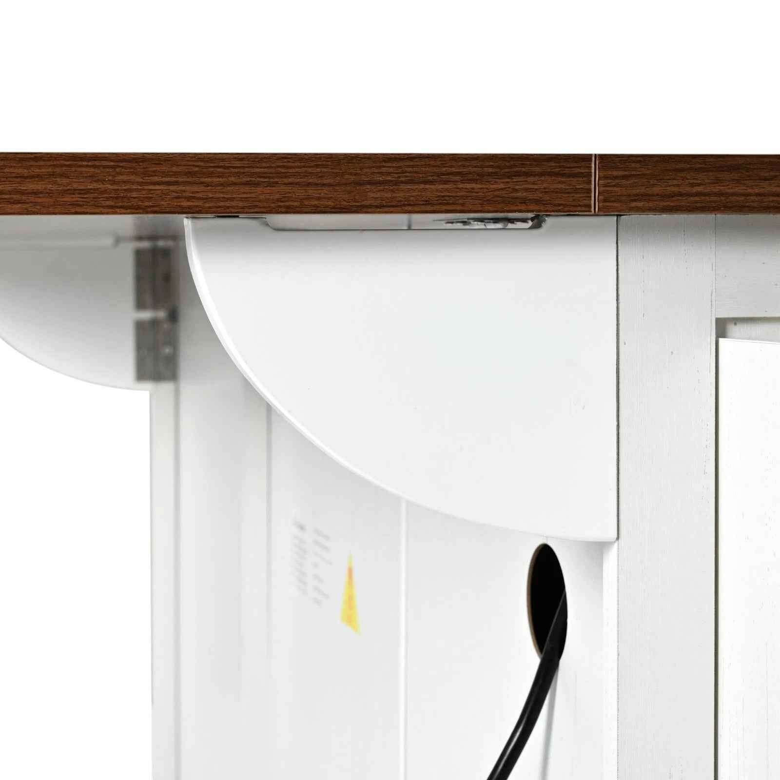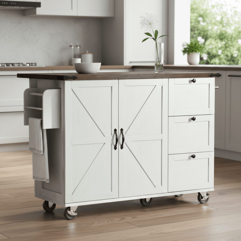 This 55-inch white wood rolling kitchen island will add a cohesive look to the kitchen while also providing additional space and functionality. This durable solid and manufactured wood rectangular island frees up a tremendous amount of space in your kitchen area, allowing you more flexibility as you prepare meals or serve guests. The beautiful grains and natural variations of the solid wood give this piece its own unique appearance. Drawer storage also helps to keep those handy utensils and serving essentials neat, tidy, and ready to be used. Do you ever find yourself searching for more space when meal prepping. This unit includes a drop leaf, which allows you to expand or scale down your counter space. Maximize your space with this multi- functional and good looking kitchen island. 36.50-inch h x 54.50-inch w x 28.75-inch d.