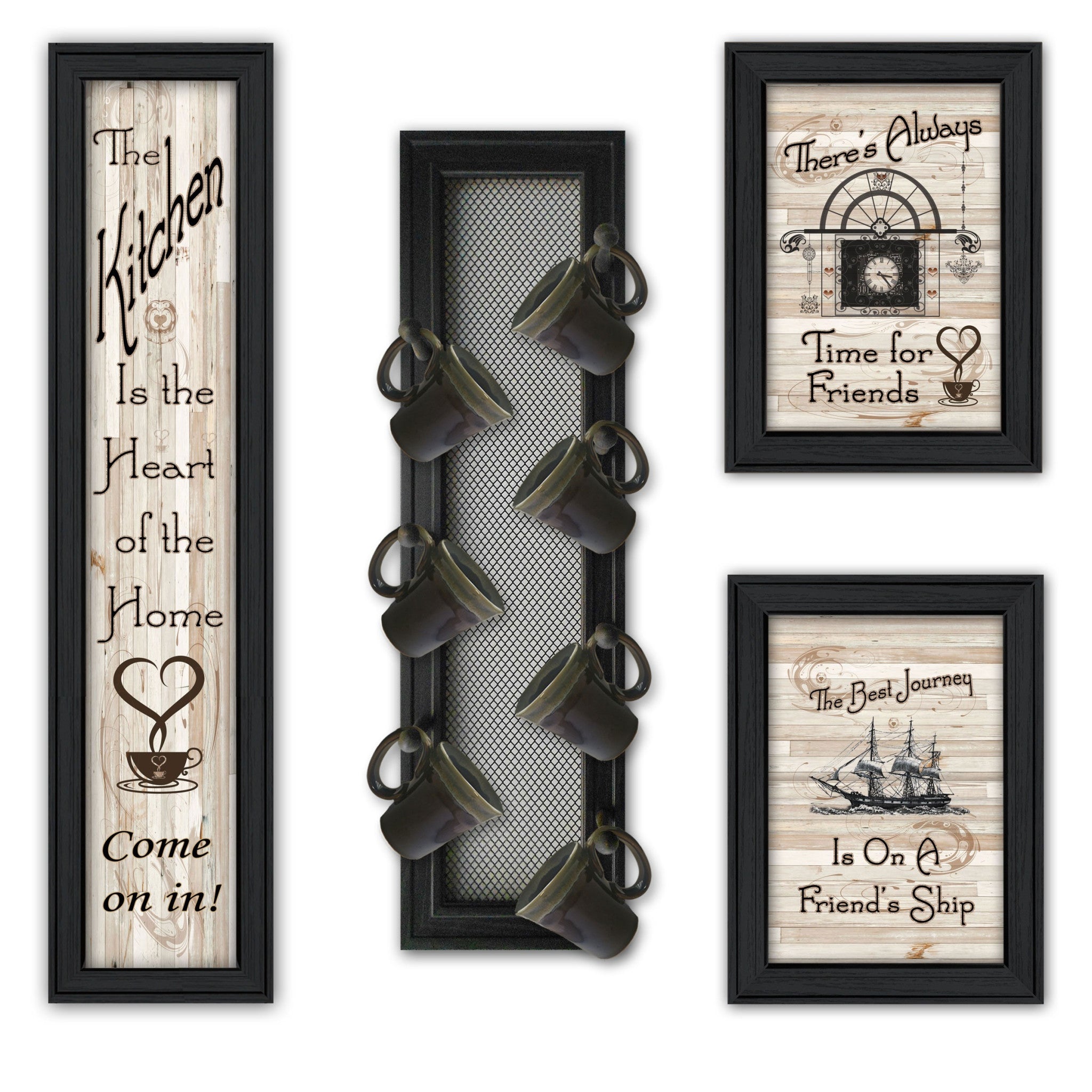 Set Of Four Come On In 3 Black Framed Kitchen Wall Prints with Mug Rack