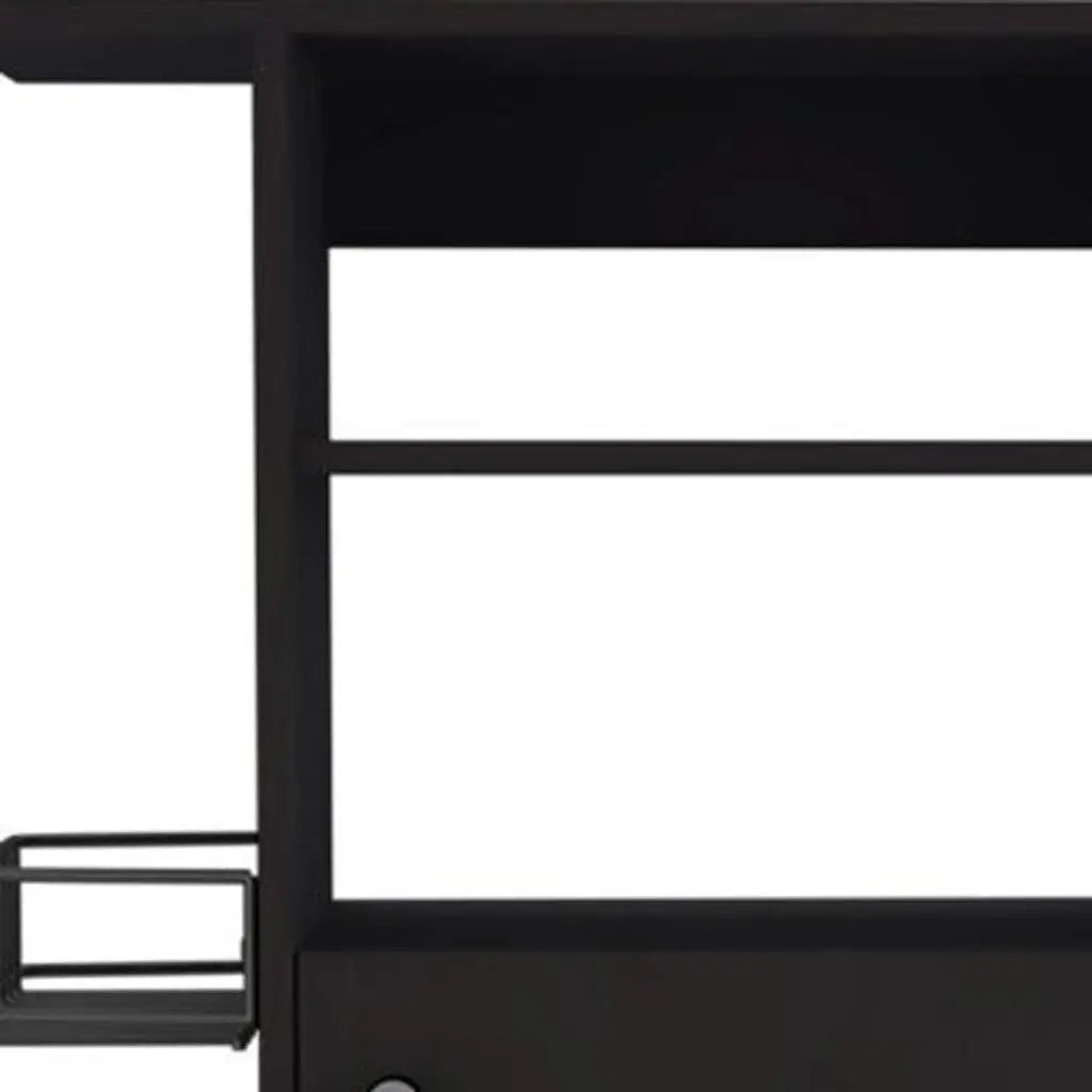 This black 24-inch rolling kitchen cart with storage will add a cohesive look to the kitchen while also providing additional space and functionality. This durable manufactured wood rectangular portable cart frees up a tremendous amount of space in your kitchen area, allowing you more flexibility as you prepare meals or serve guests. This unit features purposeful distressing for a slightly rustic and vintage design styling. Enhance the beauty and functionality of your kitchen space with this multi-purpose kitchen cart. 38.58-inch h x 23.6-inch w x 14.96-inch d.