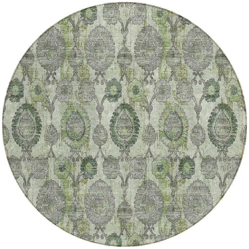 8' Artichoke Green And Fern Green Round Damask Washable Indoor Outdoor Area Rug