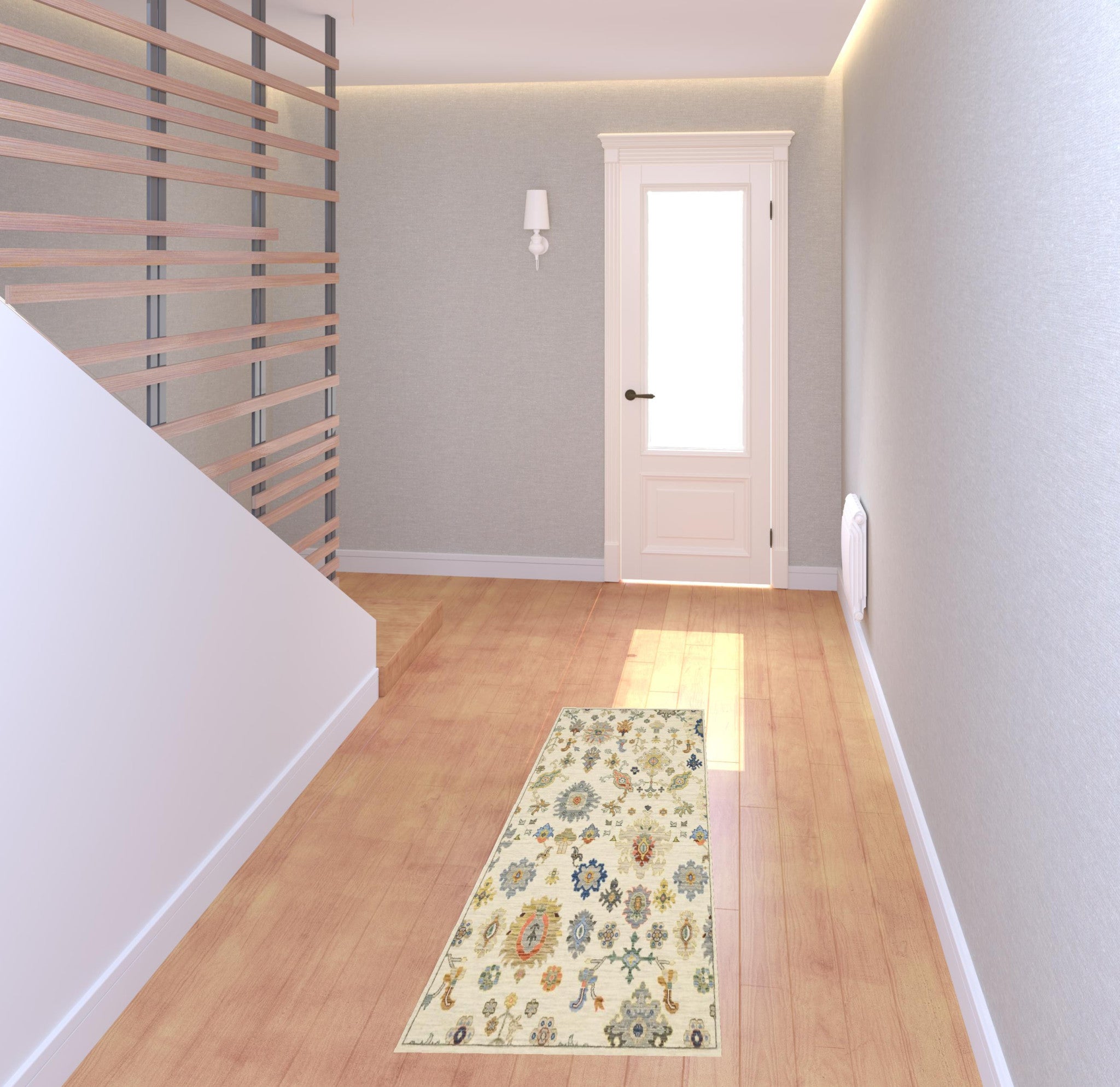2' X 6' Ivory Beige Gold Grey Blue Pink Red Rust And Green Oriental Power Loom Stain Resistant Runner Rug With Fringe
