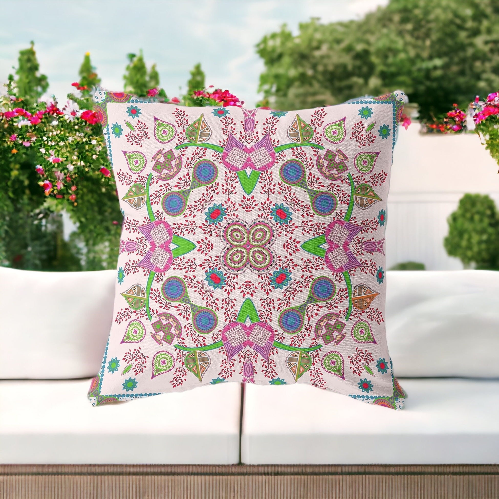 20" X 20" Pink and Green Blown Seam Paisley Indoor Outdoor Throw Pillow