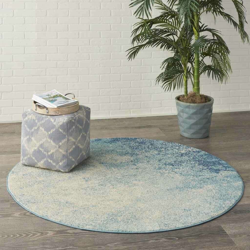 Add some artistry to your room with this 5' ivory and blue round abstract power loom area rug. This geometric round shaped rug features a abstract pattern in ivory and blue that combines a good looking print with a unique and updated shape. The mix of shape, color, and design gives this rug refreshing visual interest. This superior Turkish rug represents the highest quality and is built to last. Place this area rug against a hardwood or tile floor and it will enliven your living space with style and sophistication. 1" H x 63" W x 63" D