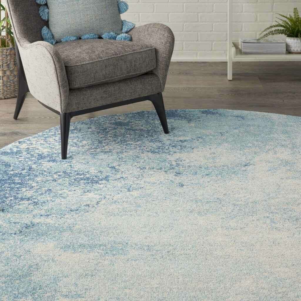 Add great coloration and comfortable texture to your space with this 8' ivory and blue round abstract power loom area rug. This geometric round shaped rug features a abstract pattern in ivory and blue that combines a good looking print with a unique and updated shape. The mix of shape, color, and design gives this rug refreshing visual interest. Made in Turkey, this rug offers high quality combined with good looking designer sensibilities. Area Rugs help to give warmth and sense of home to your space. 1" H x 96" W x 96" D