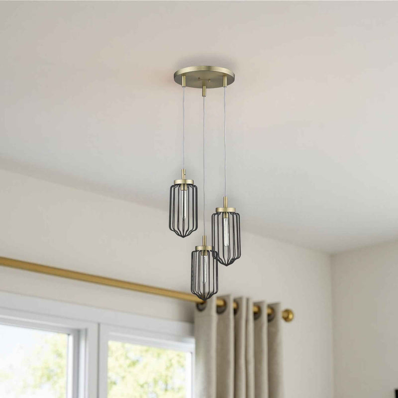 Gold Caged Three Light Metal Dimmable Chandelier With Black Shades
