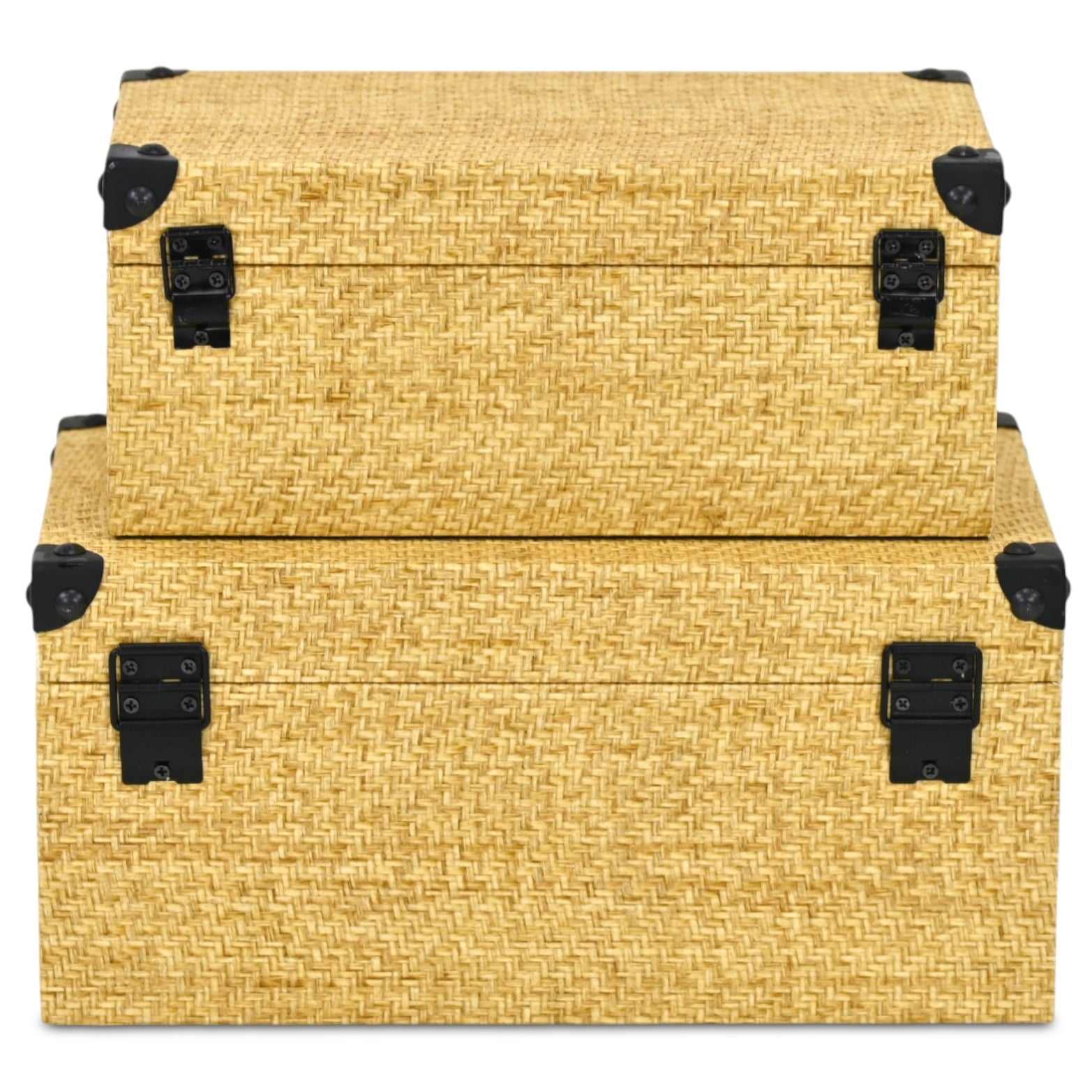 Set of Two Natural And Black Faux Rattan Nesting Storage Boxes With Lids