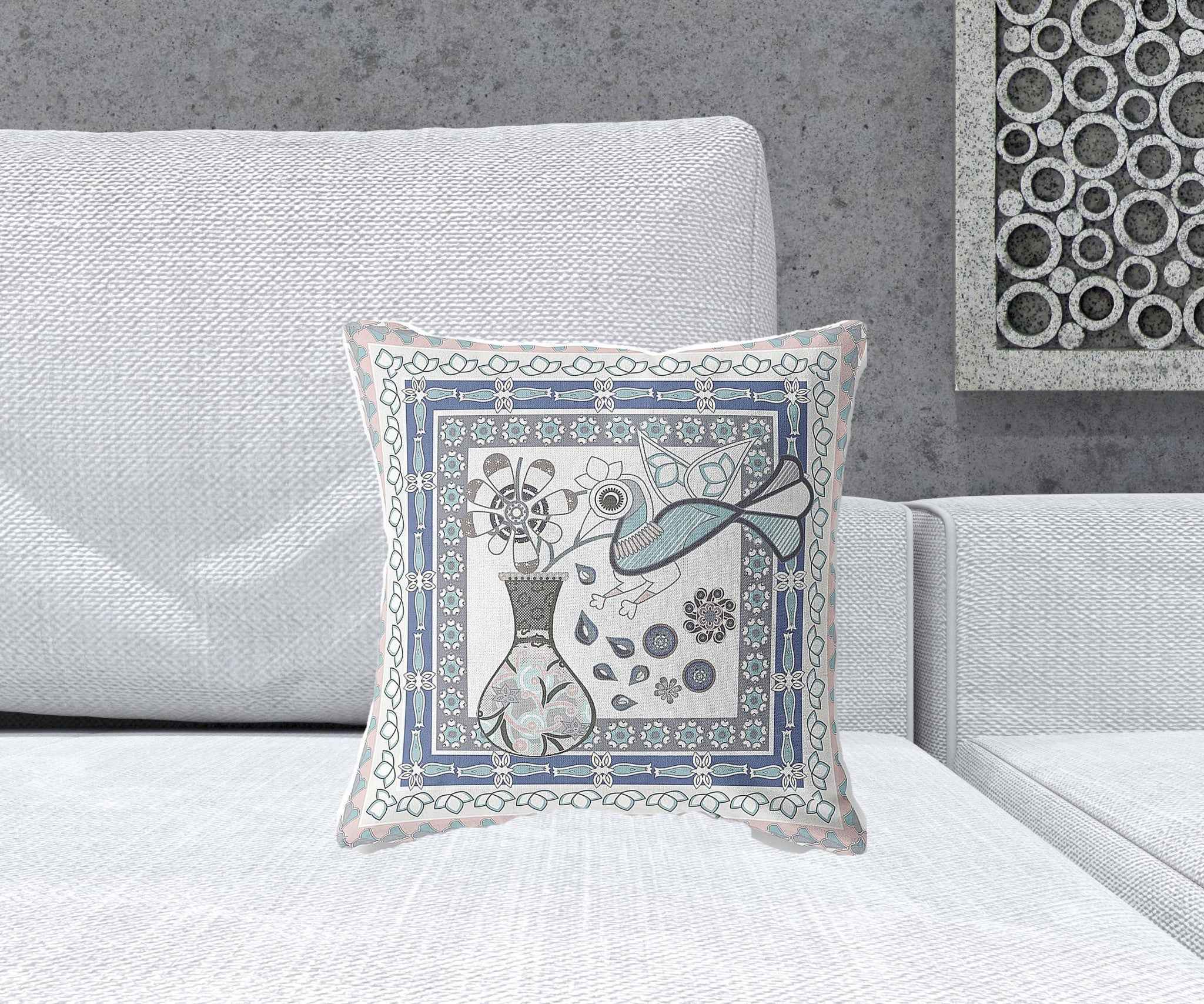 16" x 16" Pink and White Bird Blown Seam Abstract Indoor Outdoor Throw Pillow
