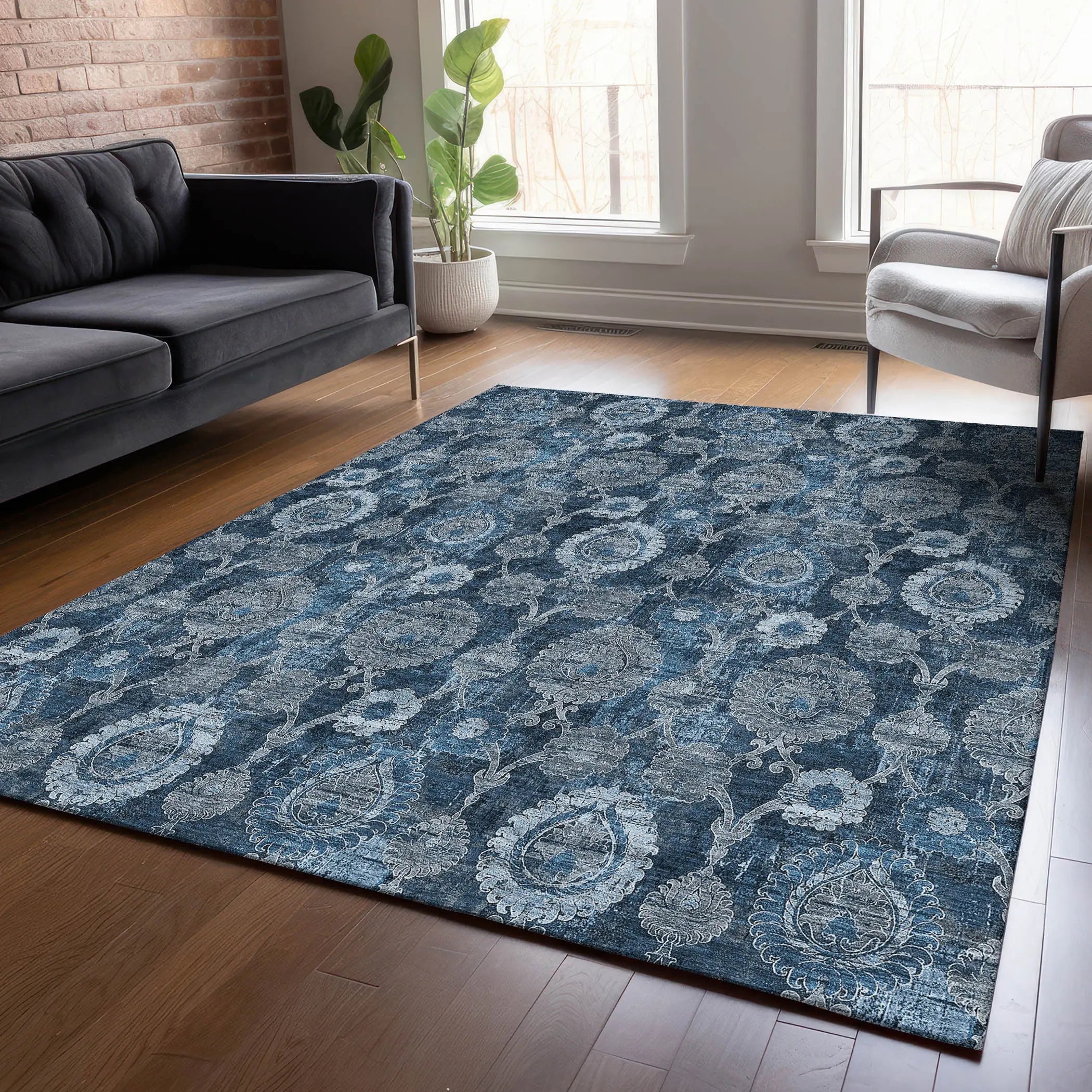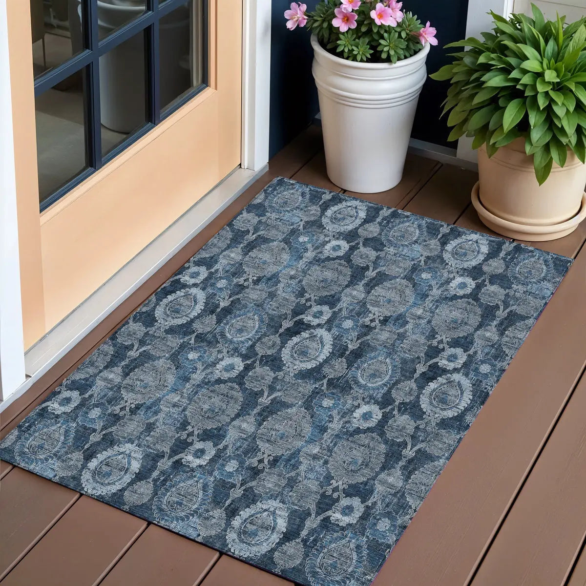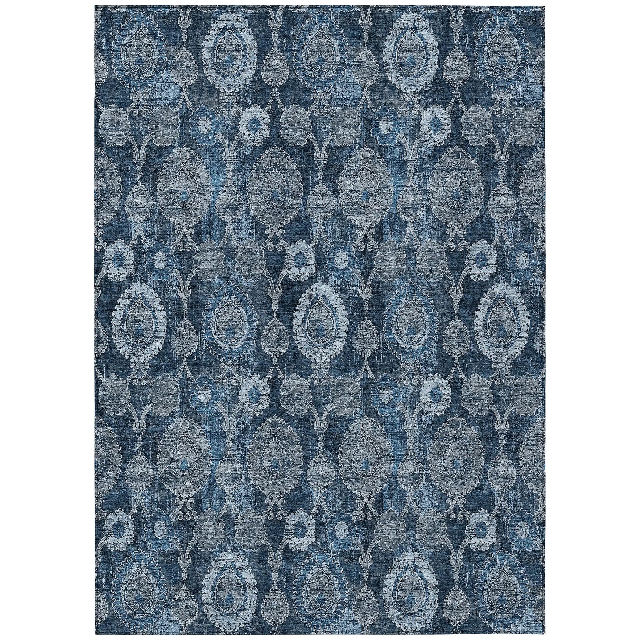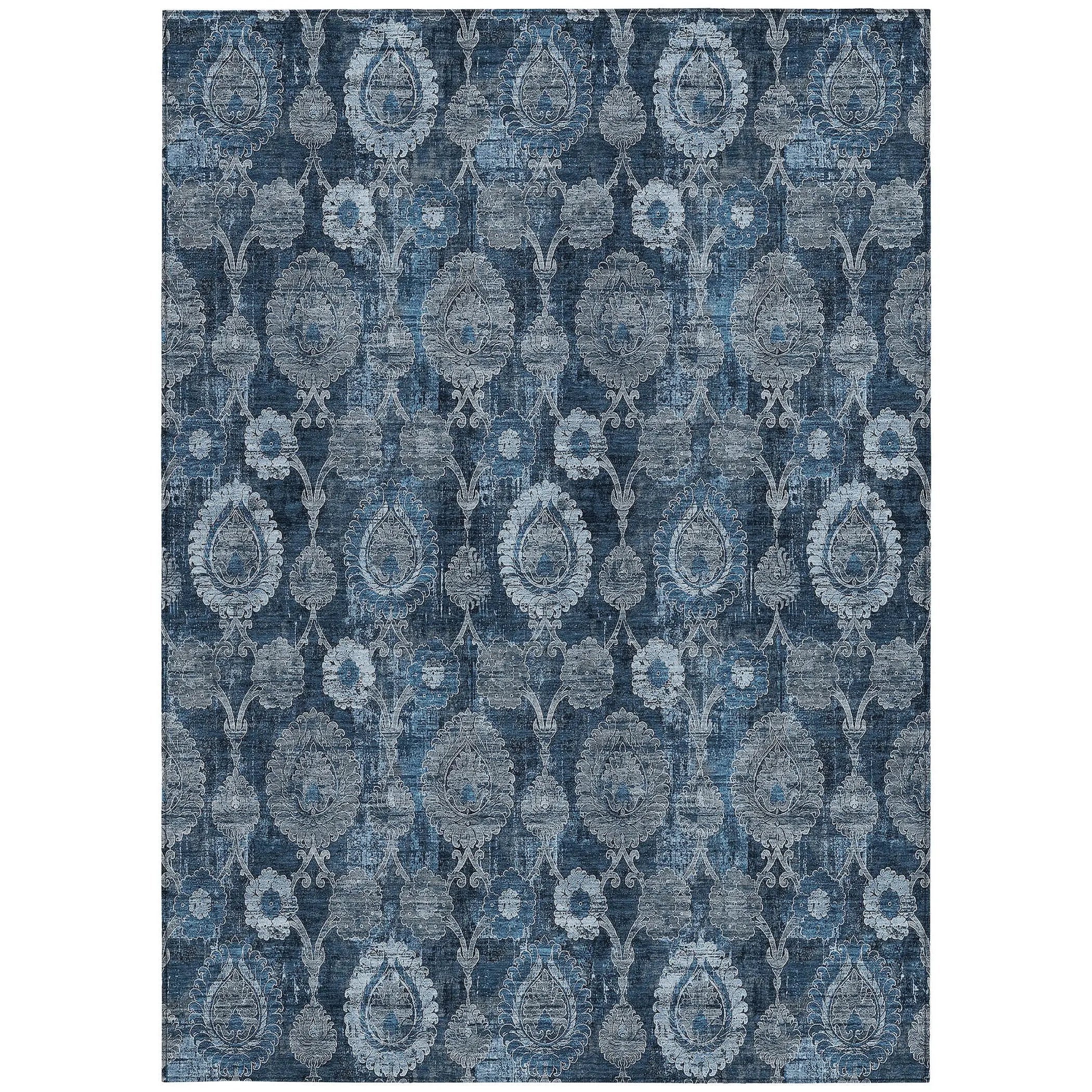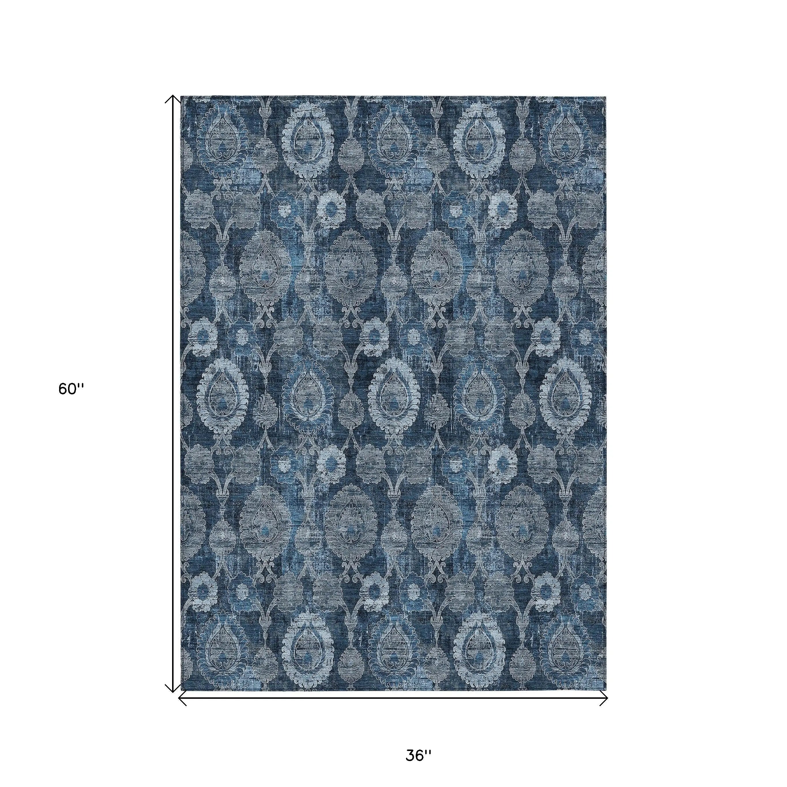 3' X 5' Navy Blue And Denim Blue Damask Washable Indoor Outdoor Area Rug