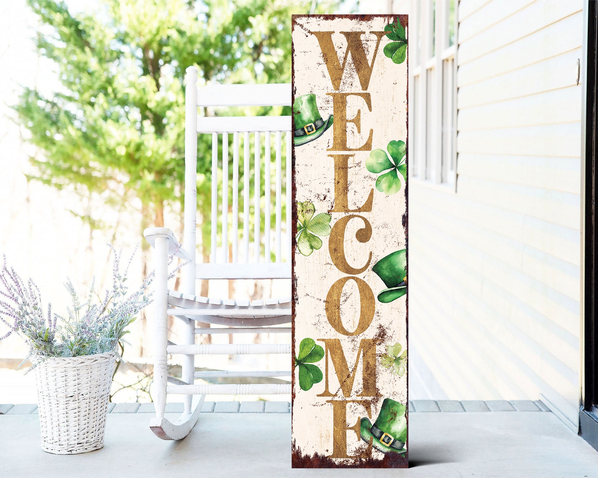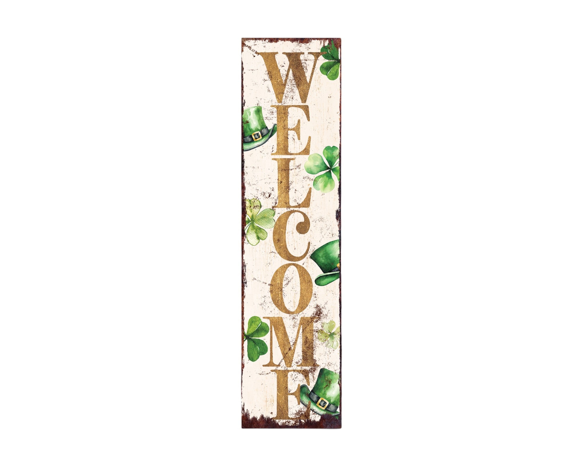 The 36-inch green gold and cream solid wood welcome st patrick's day porch sign adds a festive touch to your outdoor space. Crafted from solid wood, this durable porch sign combines traditional style with vibrant colors, enhancing your entryway. The rich green, elegant gold, and soft cream hues create an inviting atmosphere that celebrates the spirit of st patrick's day. Perfect for greeting guests, this accessory brings joy and charm to your garden or porch. Its timeless design ensures it will be a cherished part of your holiday decorations for years to come. Elevate your outdoor decor with this delightful piece that embodies the essence of celebration and tradition. 36.00-inch h x 10.00-inch w x 1.00-inch d.