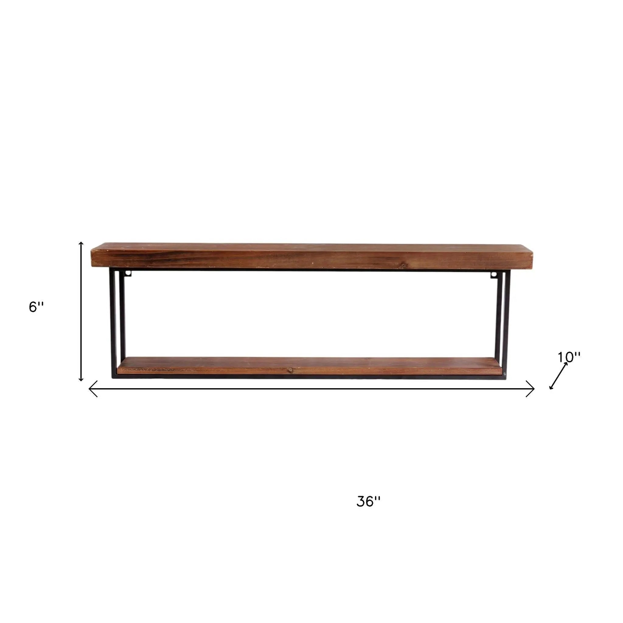 The 36-inch set of two black and brown wood and metal two level accent shelf is a stylish addition to any room. Crafted from durable manufactured wood and metal, this shelf set combines functionality with a traditional aesthetic. Its sleek black and brown color scheme enhances various decor styles, making it perfect for the living room, bedroom, bathroom, or office. The single shelving unit features two levels, providing ample space for displaying decorative items or organizing essentials. Elevate your home decor with this versatile accent shelf that blends form and function seamlessly. 6-inch h x 36-inch w x 10-inch d.