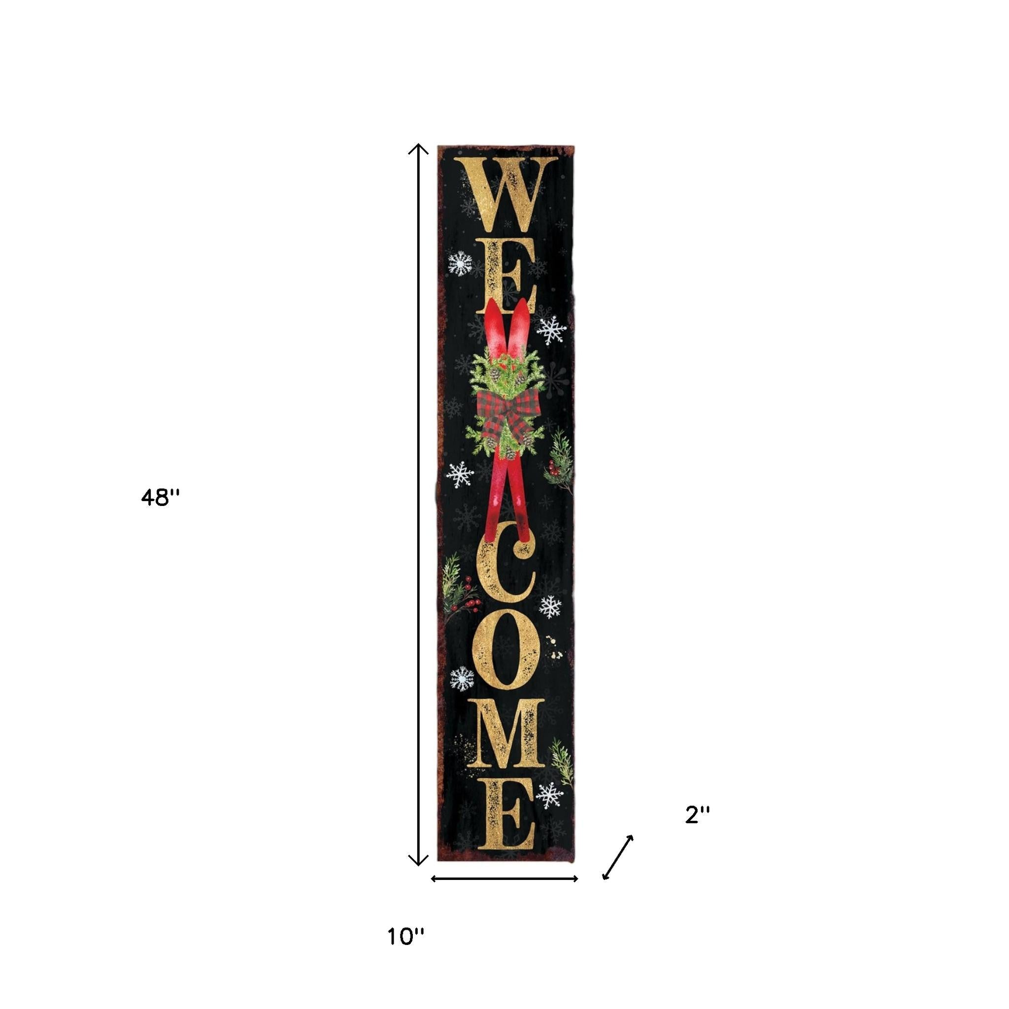 The 48-inch black gold red and green christmas wreath solid wood porch sign is the perfect outdoor accessory to enhance your festive decor. Crafted from sturdy solid wood, this traditional porch sign exudes an inviting charm that complements any entryway. The rich colors of black, gold, red, and green come together beautifully, making it a striking addition to your holiday decorations. This unique piece not only welcomes guests but also brings a joyful spirit to your home during the christmas season. Embrace the warmth and cheer of the holidays with this exquisite outdoor decor that will be cherished for years to come. Transform your porch into a winter wonderland with this delightful sign as the centerpiece. 48.00-inch h x 10.00-inch w x 2.00-inch d.