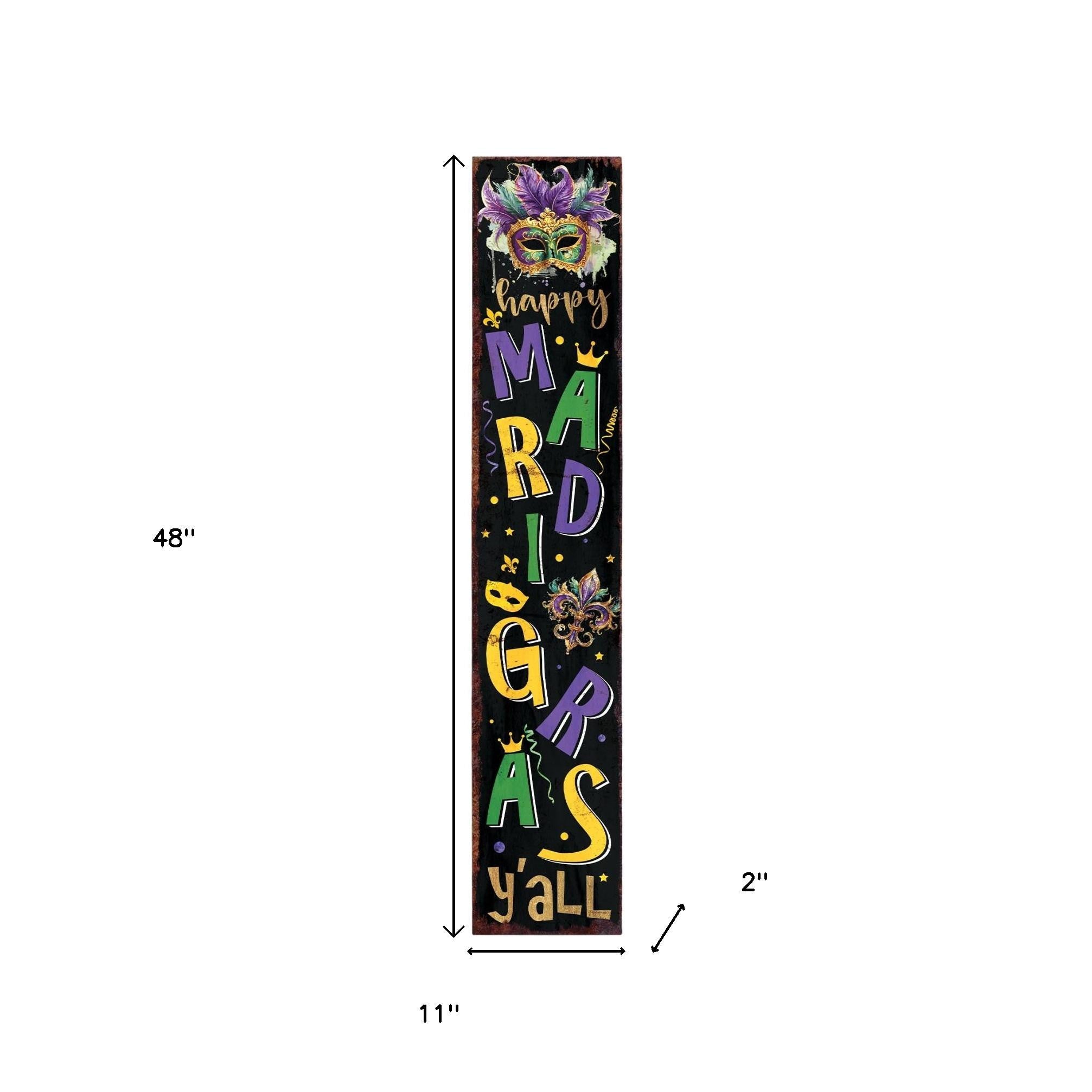 The 48-inch black purple green and yellow mardi gras fireworks solid wood porch sign adds a festive touch to your outdoor space. Crafted from durable solid wood, this porch sign showcases a traditional style that complements various home aesthetics. The vibrant colors of black, purple, green, and yellow embody the spirit of mardi gras, making it perfect for celebrations or year-round decoration. This accessory not only enhances your garden decor but also invites guests to join in on the fun and festivities. Elevate your outdoor area with this charming sign, which provides a warm welcome to family and friends alike. Perfect for brightening up porches and entryways, it’s a delightful addition to any home. 48.00-inch h x 11.00-inch w x 2.00-inch d.