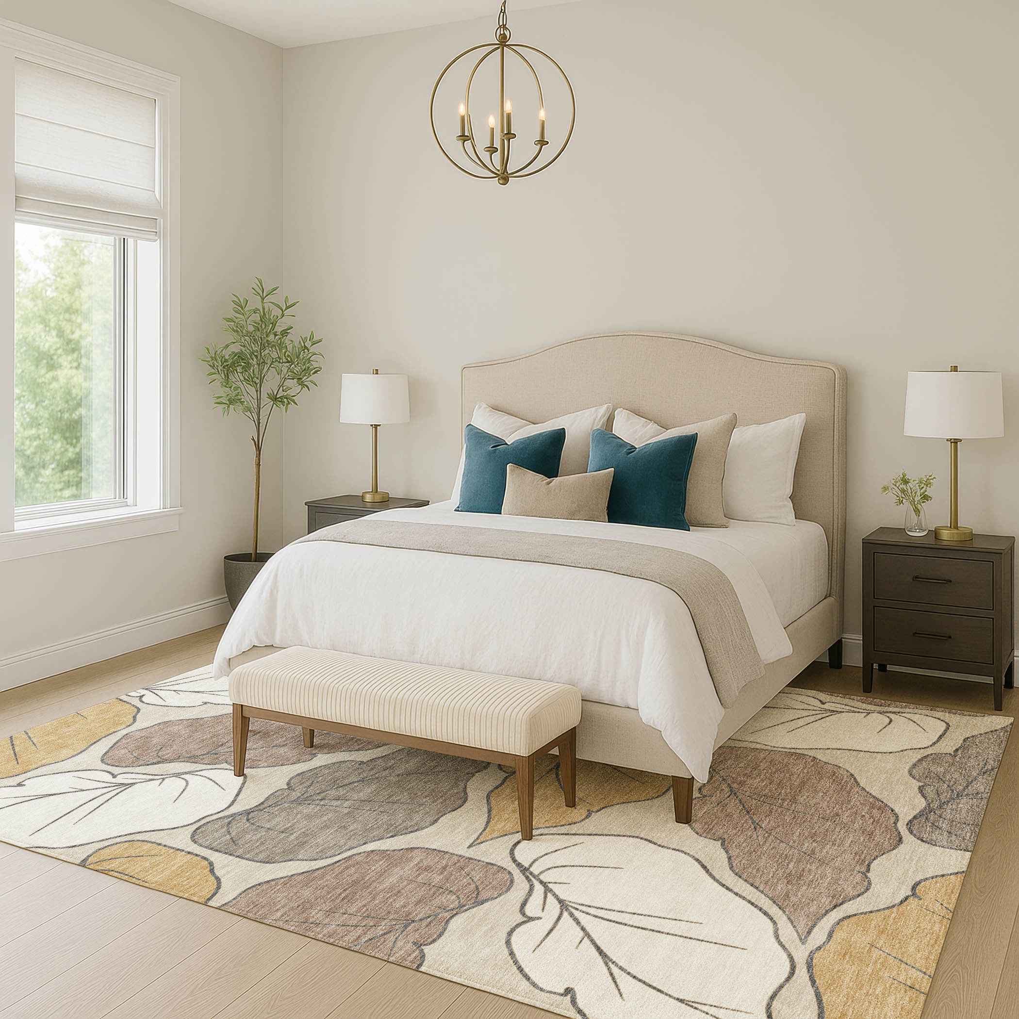 5' X 8' Linen Ivory And Brown Botanical Leaves Washable Indoor Outdoor Area Rug