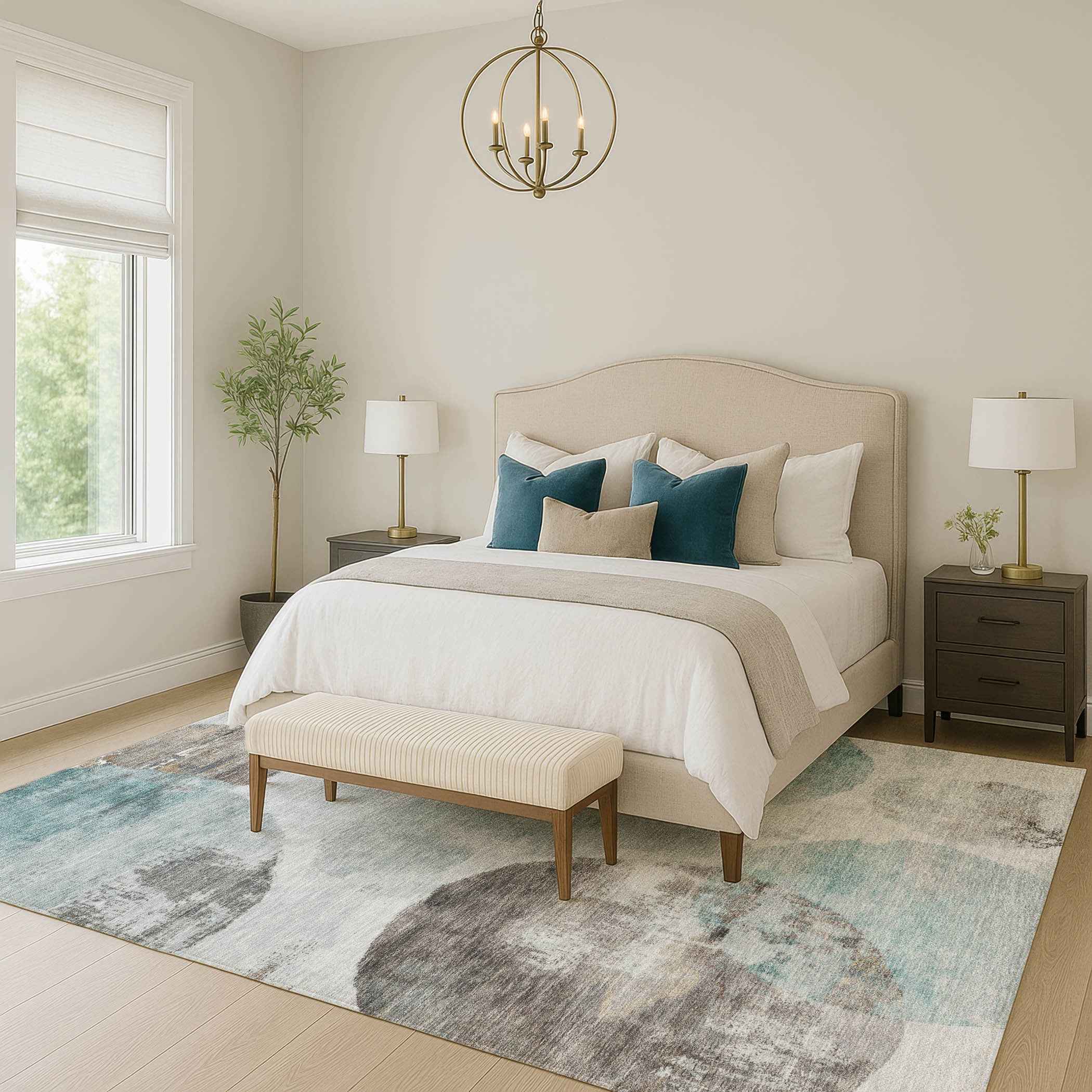 This 5-foot x 8-foot teal blue ivory and taupe abstract washable indoor outdoor area rug, is a great way to add warmth to a room. This rectangle shaped rug features a abstract design that will work well both indoors or out. A classic shape marries with good looking design for your living room, hall, bedroom, porch, patio, or poolside. Ideal for outdoor spaces or high traffic areas with kids and pets, this rug is made from heavy duty polyester that is stain resistant to help repel water, dirt, and stains. Versatile in use, durable, and easy to maintain, this rug is an ideal solution to add a decorative and inviting touch to your indoor or outdoor space. 60.00-inch h x 90.00-inch w x 0.19-inch d.