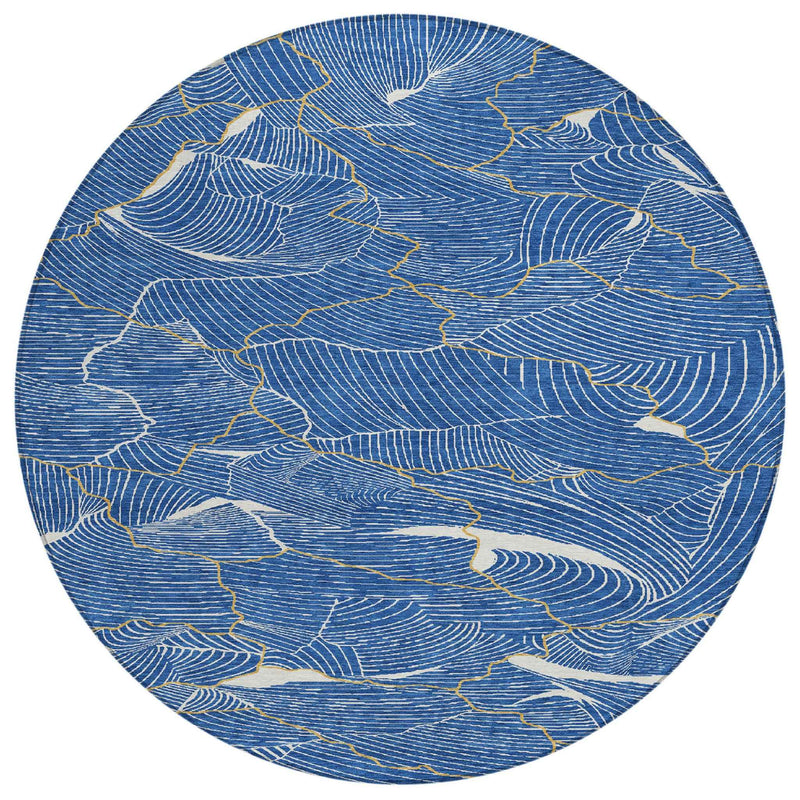 8' Blue Ivory And Gold Round Abstract Washable Indoor Outdoor Area Rug