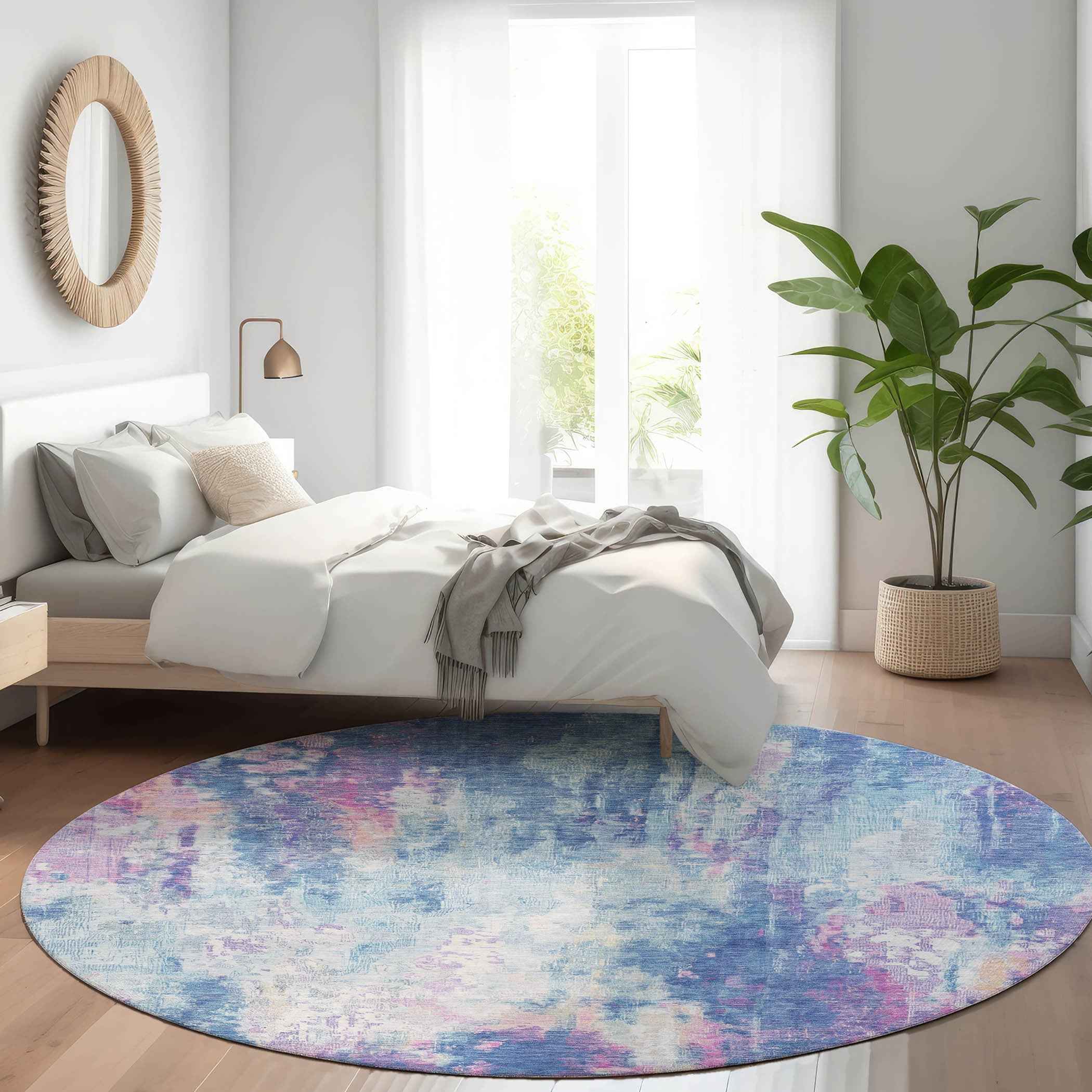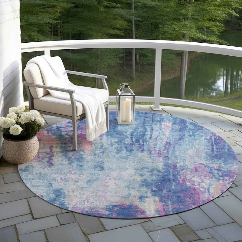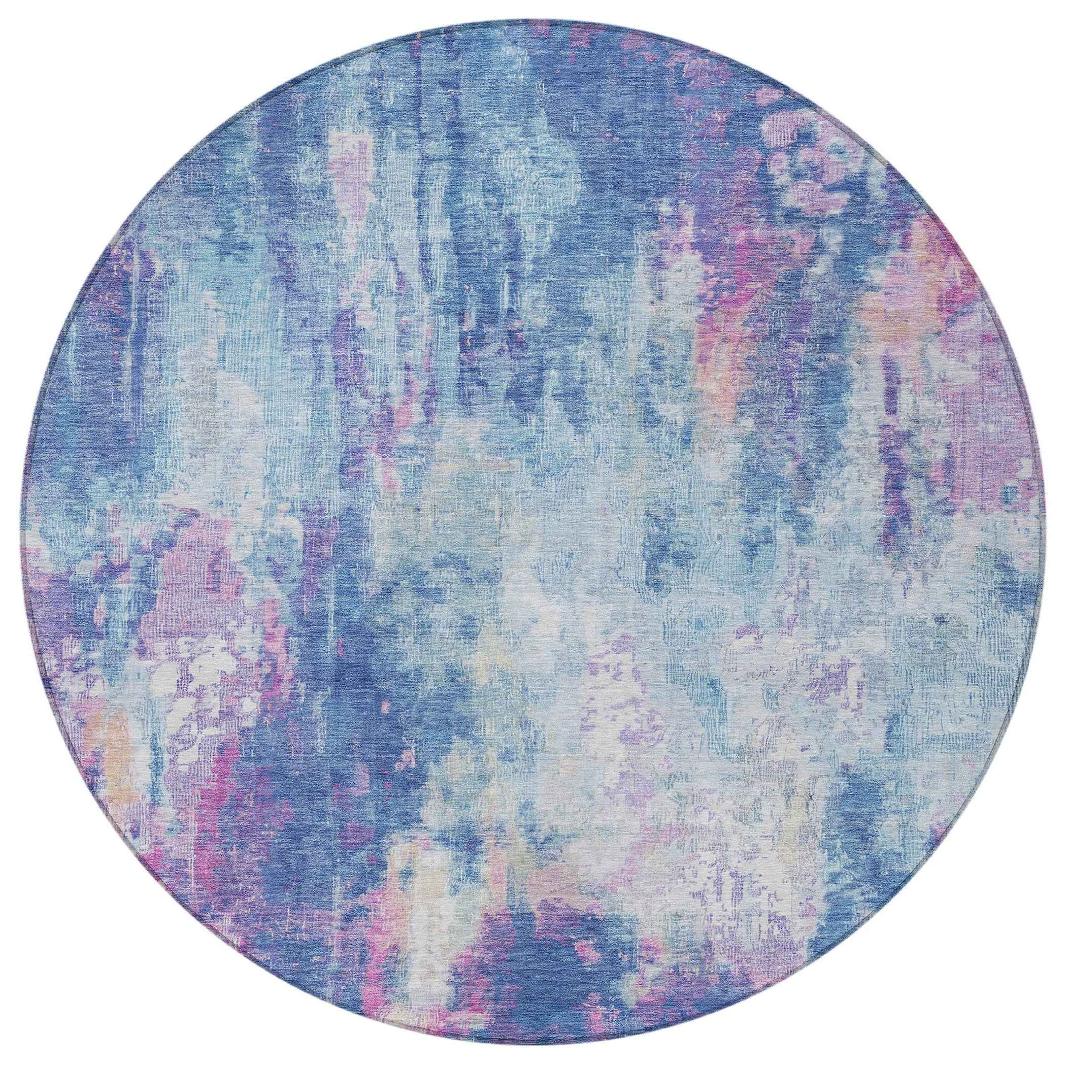 8' Blue Peach And Sky Blue Round Abstract Washable Indoor Outdoor Area Rug
