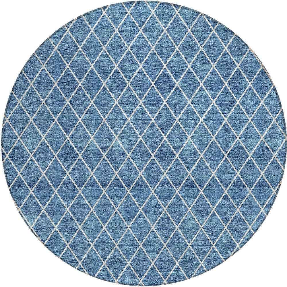 8' Denim Blue And Ivory Round Geometric Washable Indoor Outdoor Area Rug