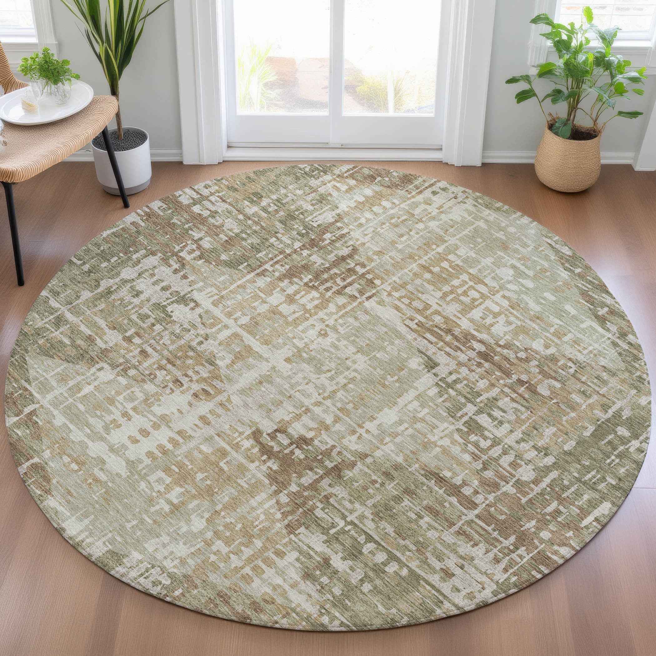 8' Fern Green And Beige Round Geometric Washable Indoor Outdoor Area Rug