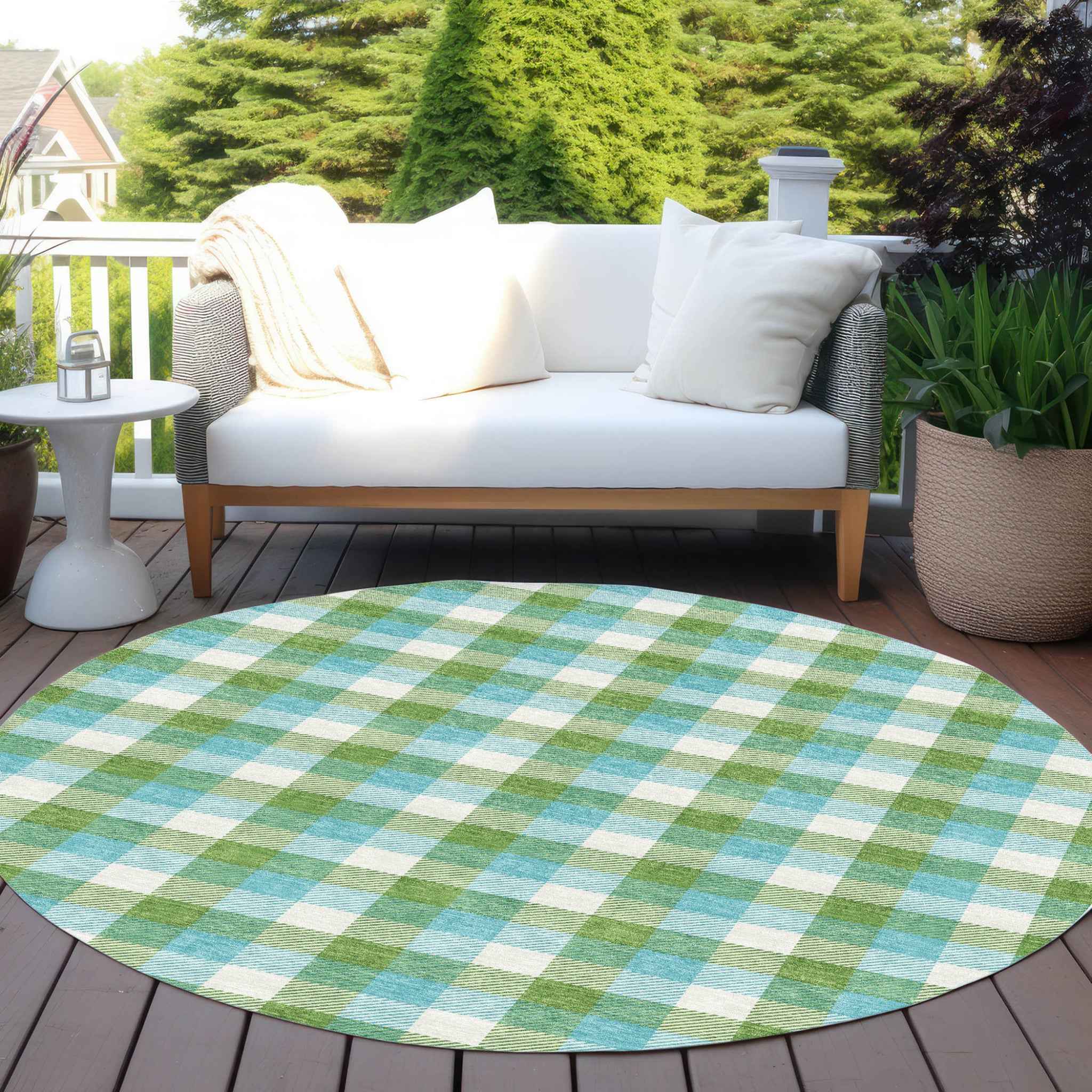 8' Lime Green Aqua And Beige Round Plaid Washable Indoor Outdoor Area Rug