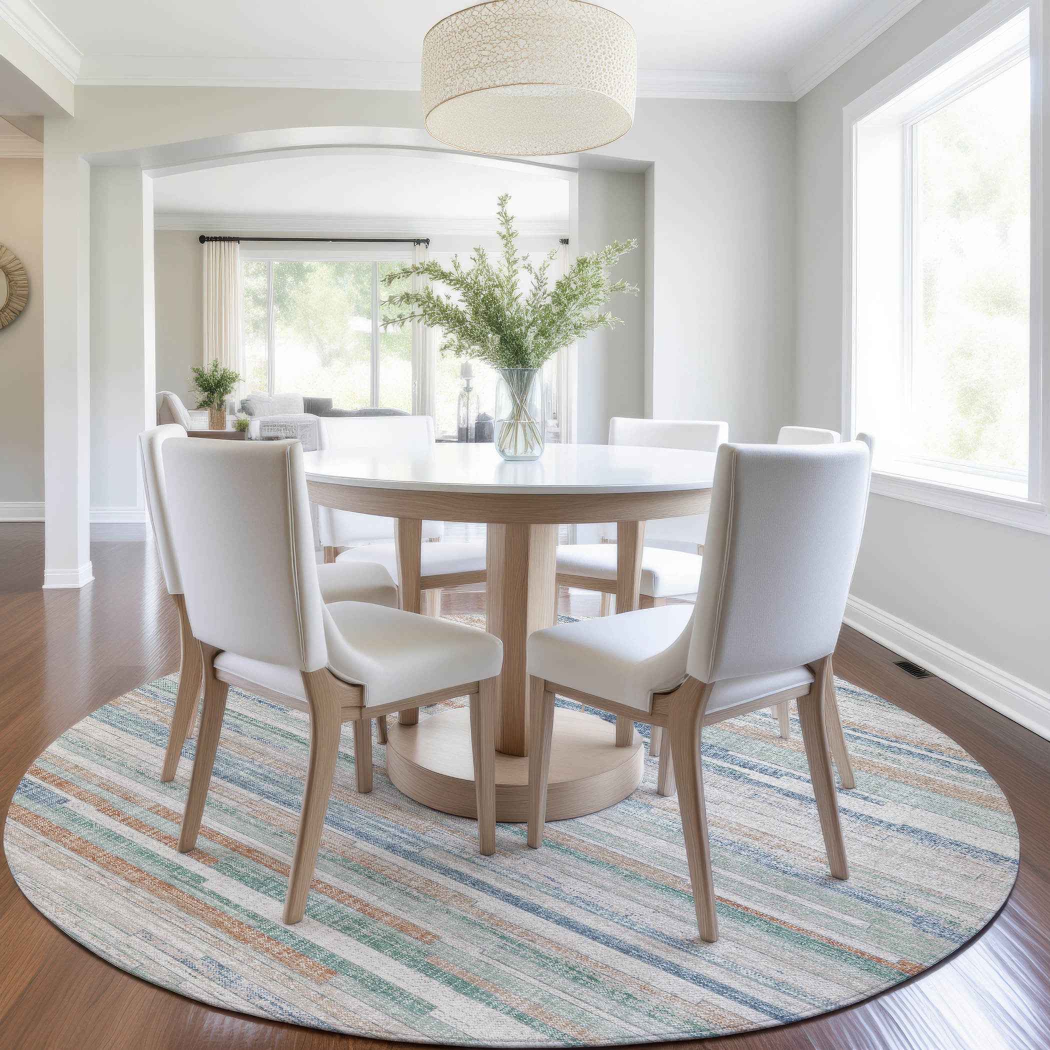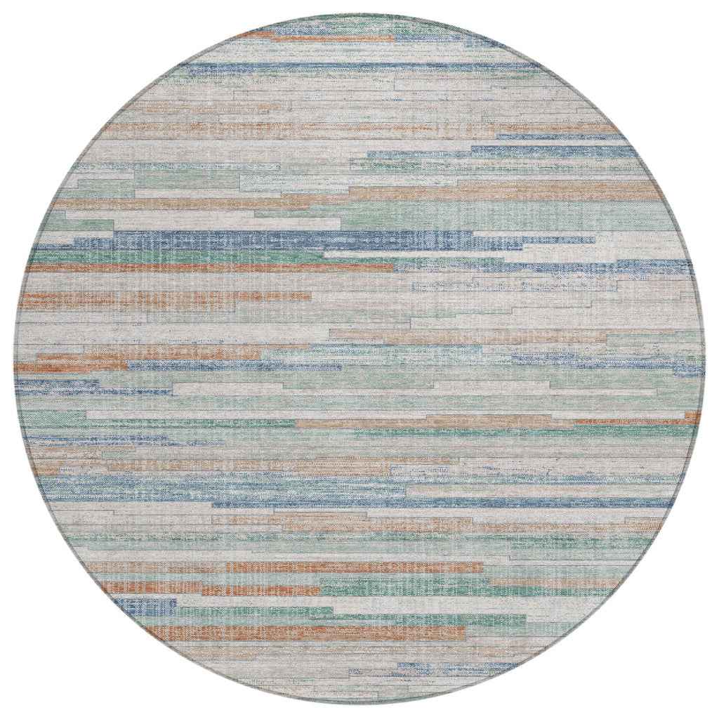 8' Linen And Pale Aqua Round Striped Washable Indoor Outdoor Area Rug