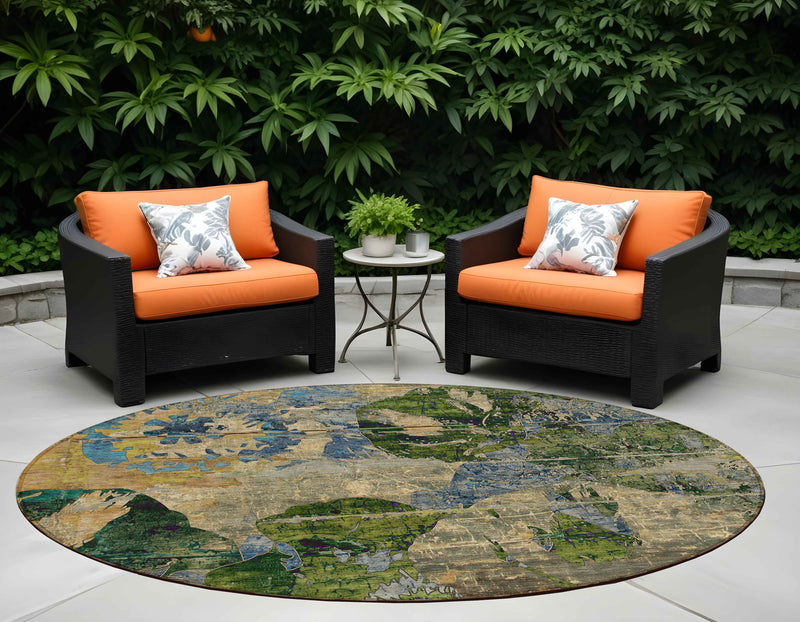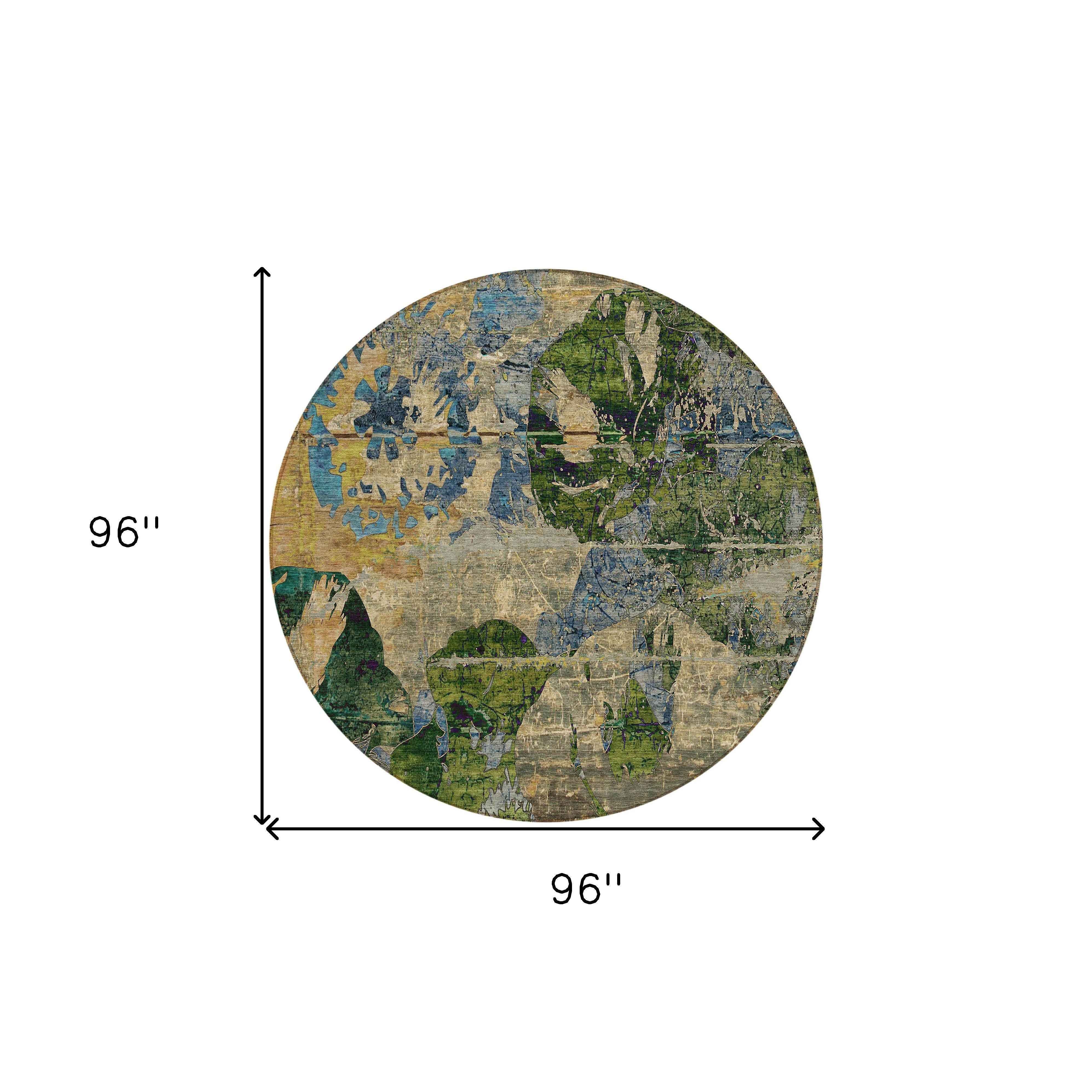8' Round Taupe Blue and Green Round Floral Washable Non Skid Indoor Outdoor Area Rug