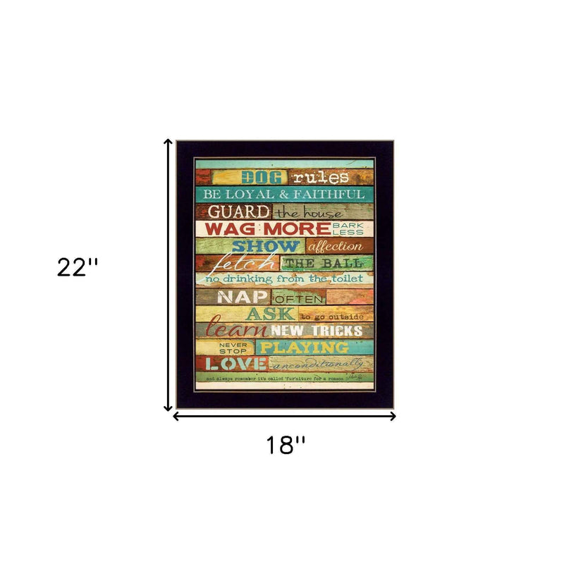 The dog rules 8 black framed print wall art is the perfect decorative accessory for your home. This print is a visual artistic expression that allows you to decorate your space in style. Reproduced for you on paper, this hanging decorative accent will be a trendy and fashionable way to dress your walls. Adding this hanging wall art to your space to make your room feel more finished and attractive. Utilize this opportunity to create a focal point in the room with this fabulous wall decor option. 22 inches H x 18 inches W x 1 inches D