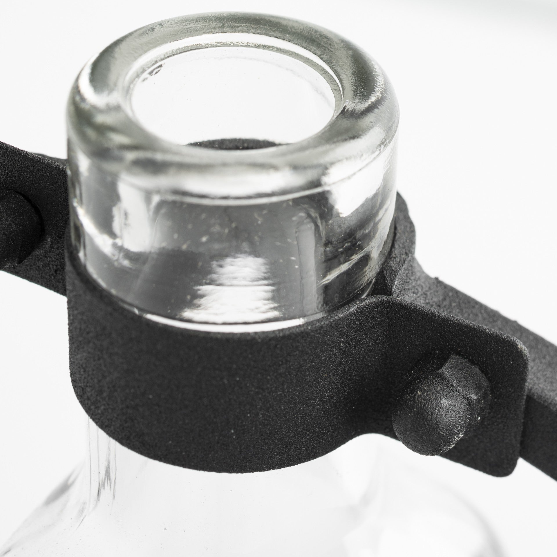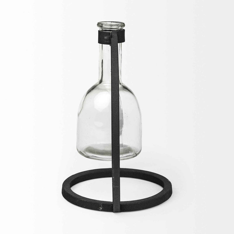 A unique decor piece, this Black Metal and Round Glass Vase will instantly add a unique design touch to any space in your home. This piece features a black metal stand that has a hollow circular base with circular rods rising up from either side and attached in the middle with a bracket. Hanging from the bracket there is a round flat-bottomed glass bottle which has a long narrow neck. This vase will elevate the look of any live flowers, dried arrangements, or artificial fauna you choose to display in it. 8" H x 5" W x 9" D