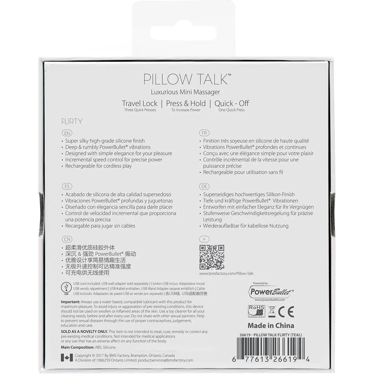 Pillow Talk is a collection that expresses beauty, fun and power, and Flirty is no exception. Its soft, flexible design promotes playful exploration while its small size makes it perfect to take with you anywhere you go. Do not let the size fool you, Flirty is packed with enough strength for even the most experienced power lover. From the handle with a padded cushion texture to the dazzling crystal button, each and every feature of Flirty is made with you in mind. With the rechargeable battery and included USB charging cord, Pillow Talk is always ready when you are.