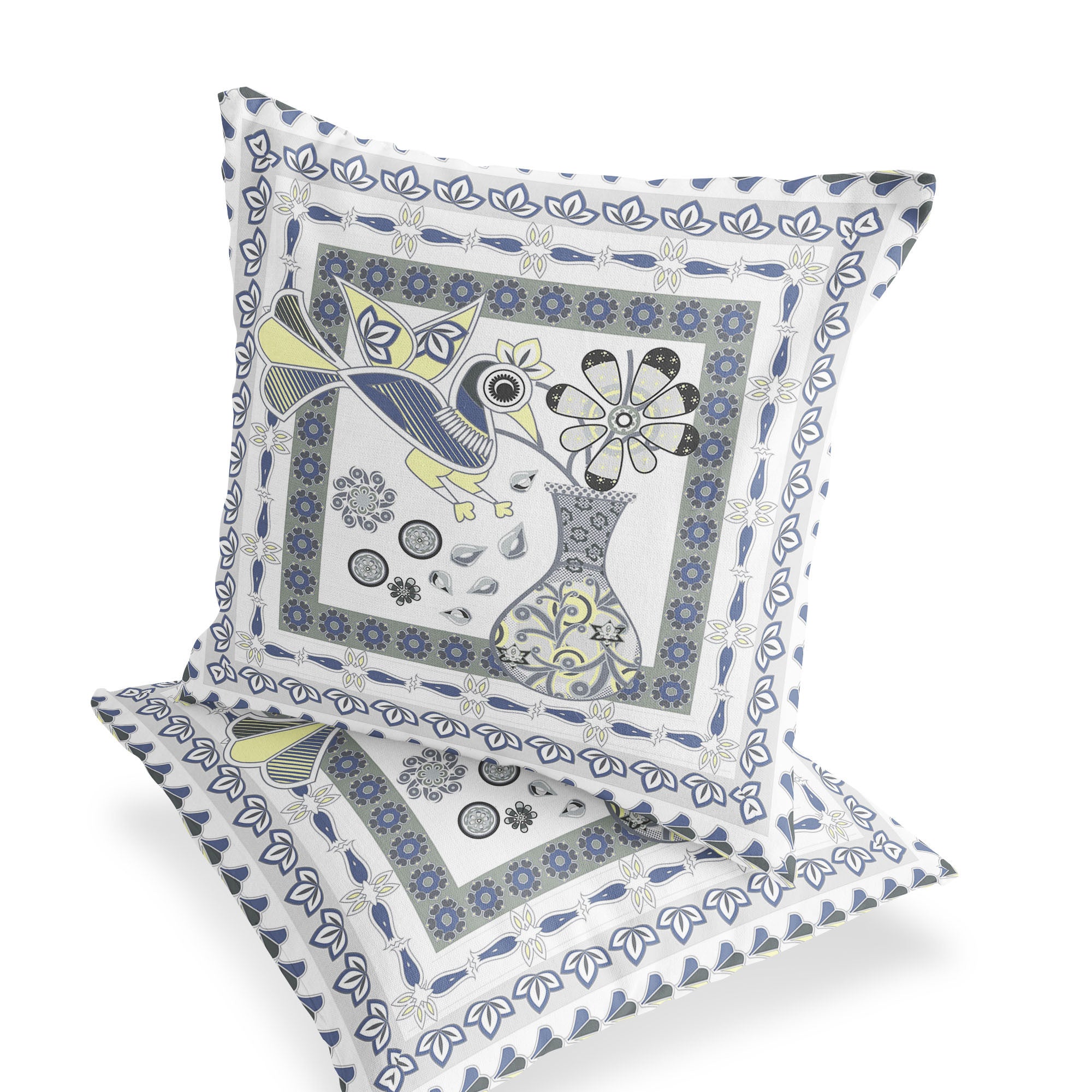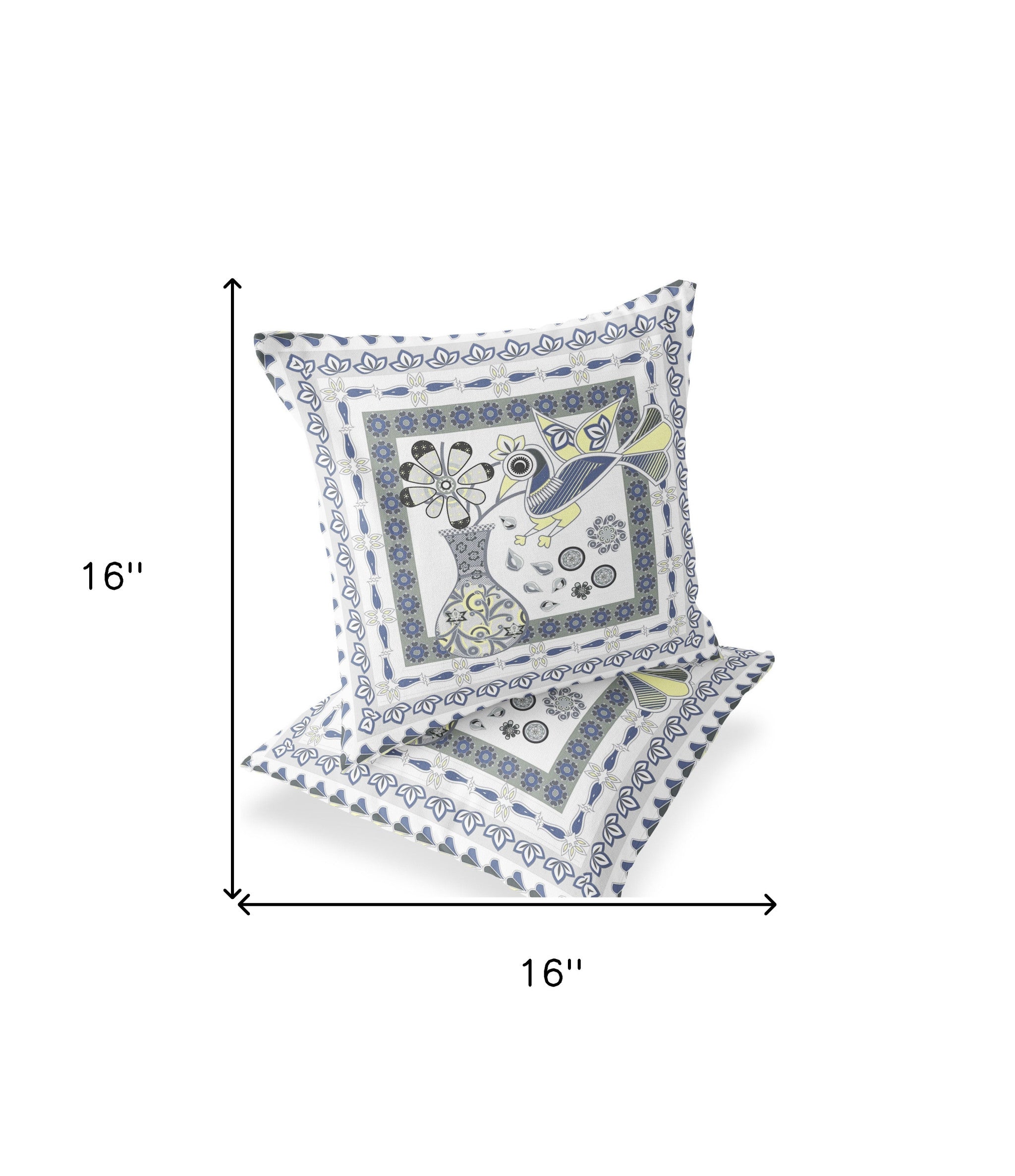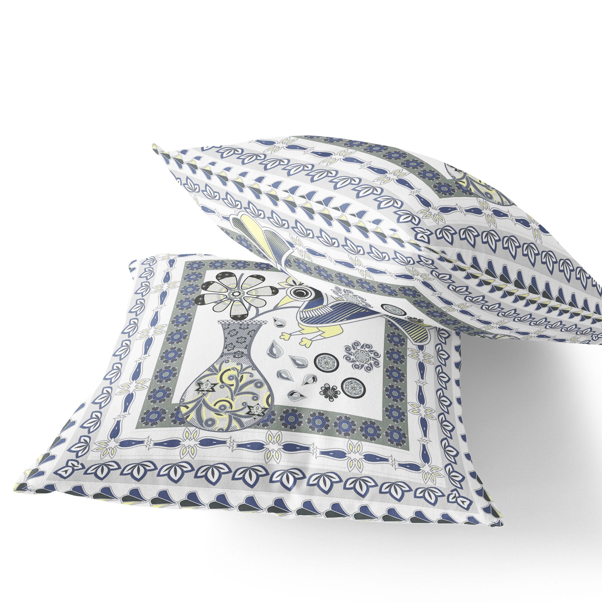 Set of Two 16" X 16" Gray and White Peacock Blown Seam Floral Indoor Outdoor Throw Pillow
