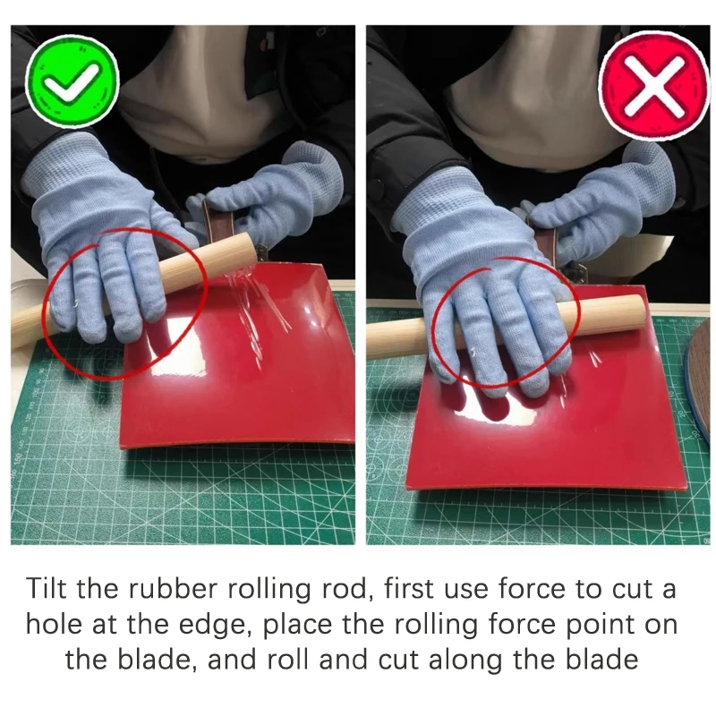 Cutting the Rubber: Flip the blade so the rubber faces upward. Use a rolling pin to press and cut along the edge of the blade from right to left (tilt the rolling pin outward; avoid pressing it inward against the blade) until the cutting is complete (left-handed users may cut from left to right).
