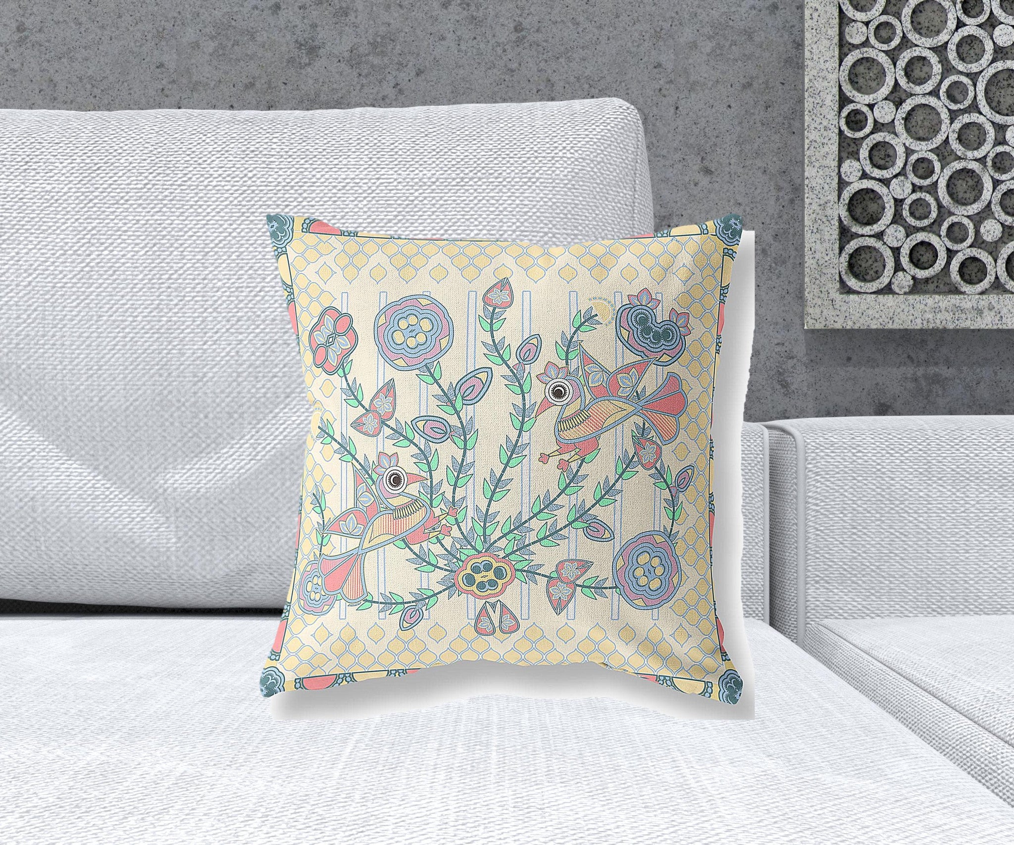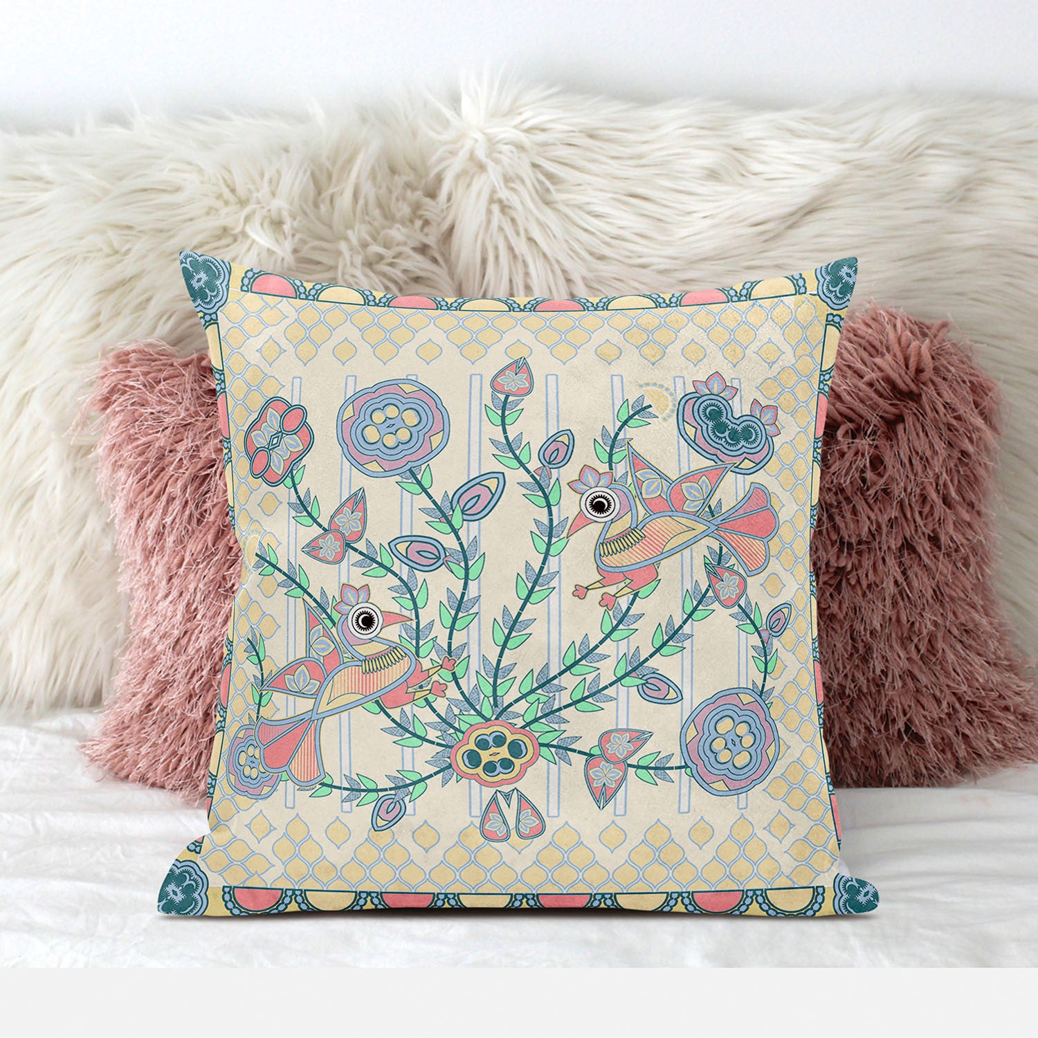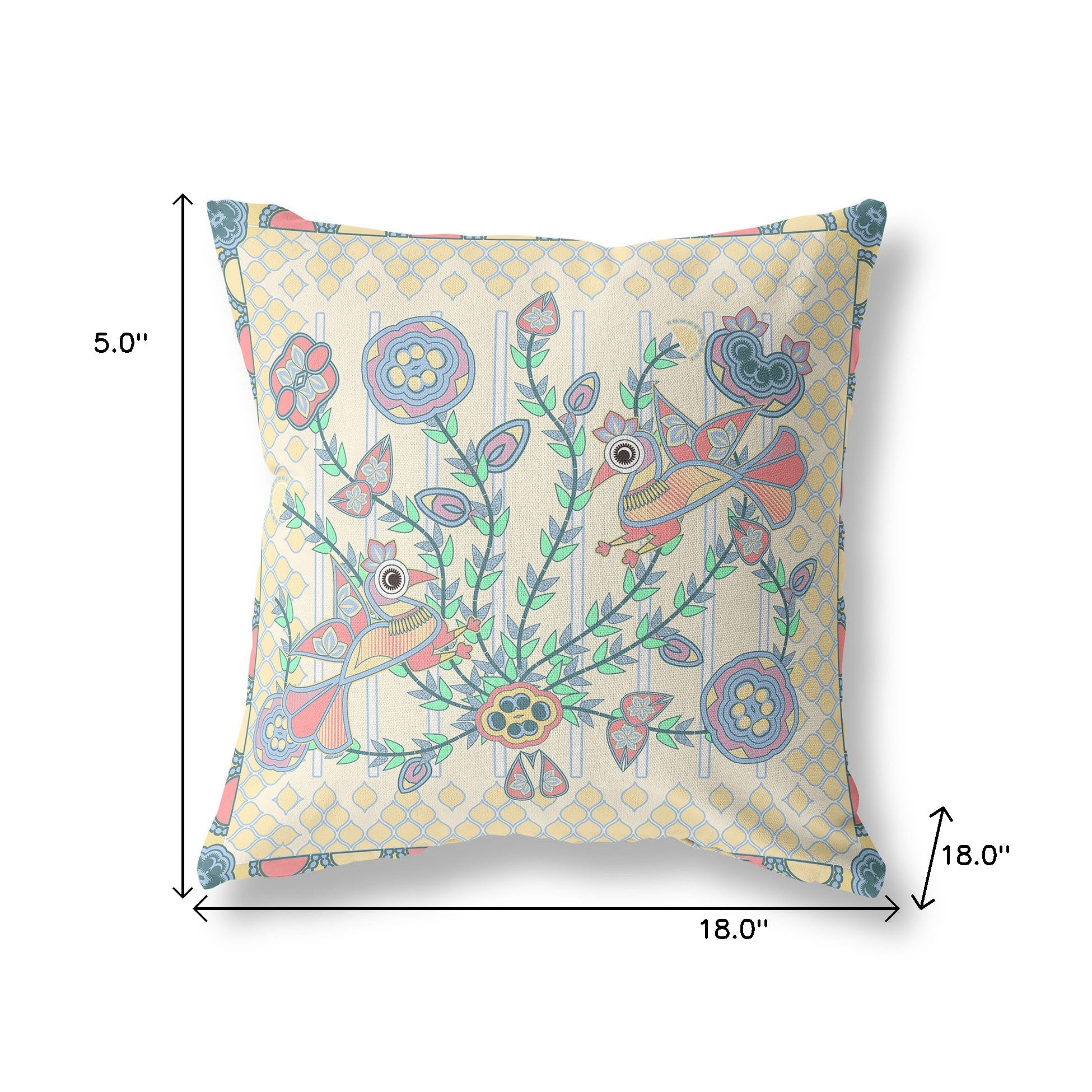 18" x 18" Pink Peacock Blown Seam Floral Indoor Outdoor Throw Pillow