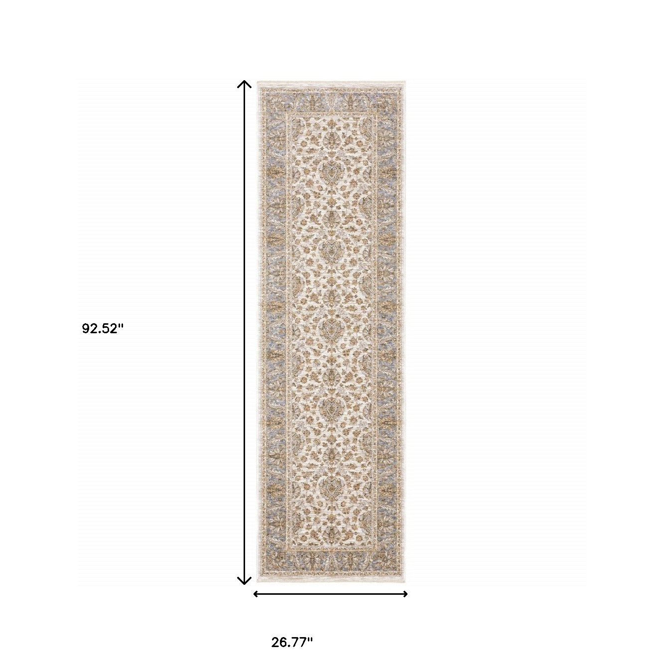 2' X 8' Ivory And Blue Oriental Power Loom Stain Resistant Runner Rug With Fringe