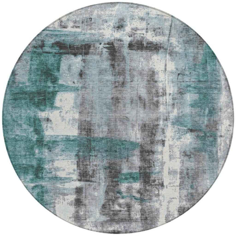 8' Teal Blue And Ivory Round Abstract Washable Indoor Outdoor Area Rug