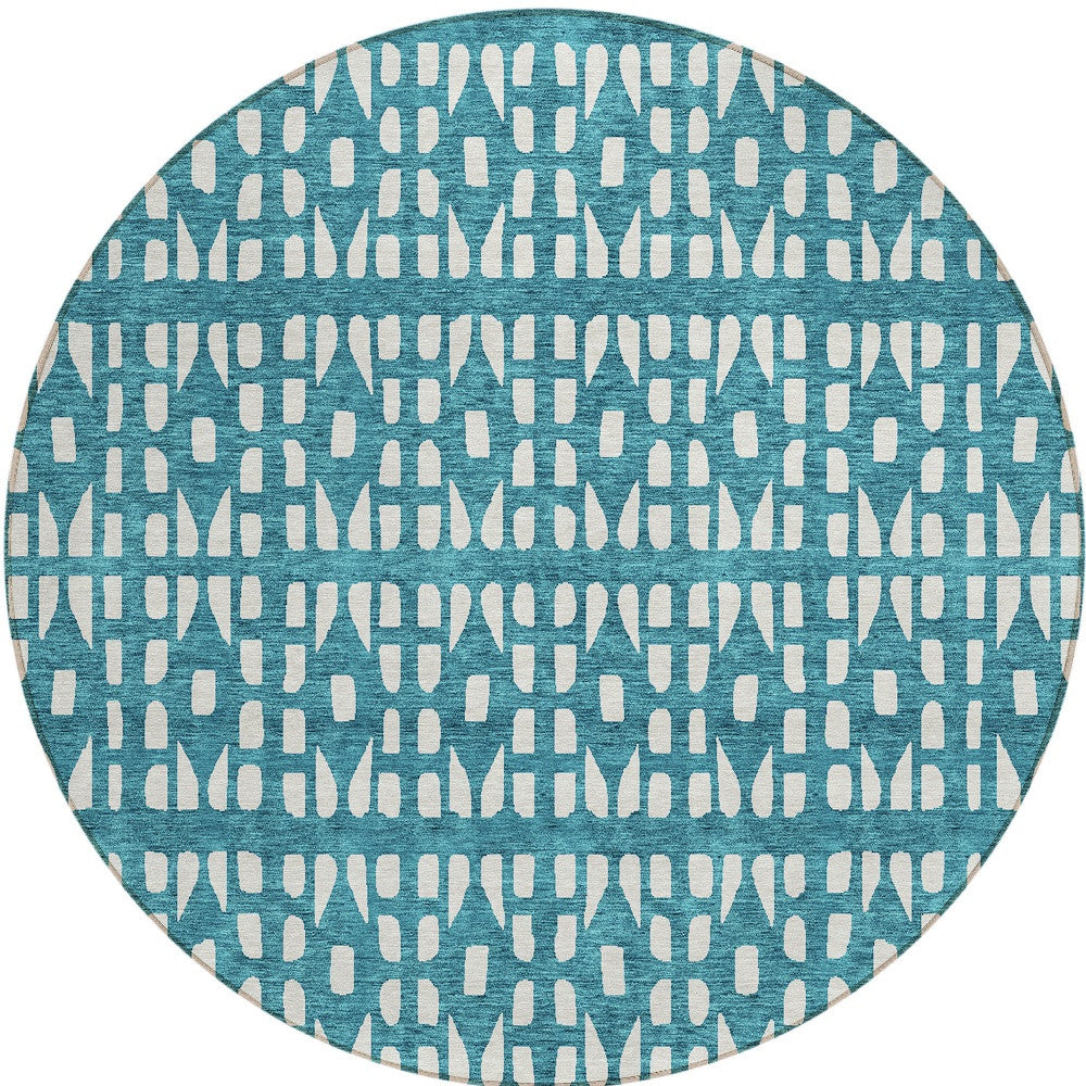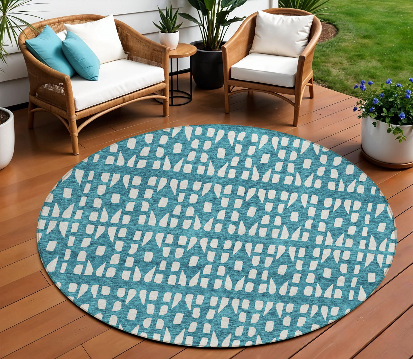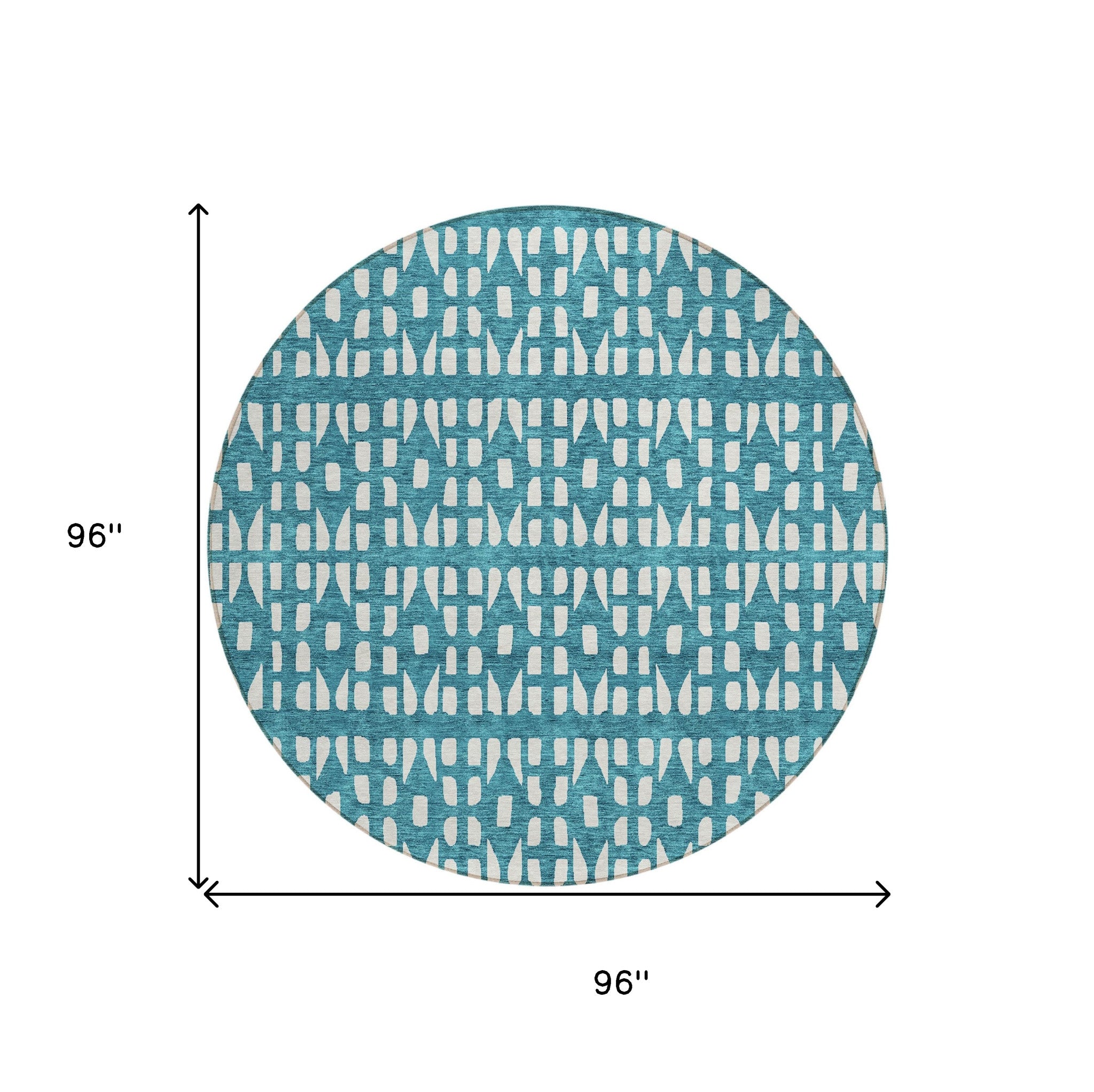 8' Teal Blue And Ivory Round Geometric Washable Indoor Outdoor Area Rug