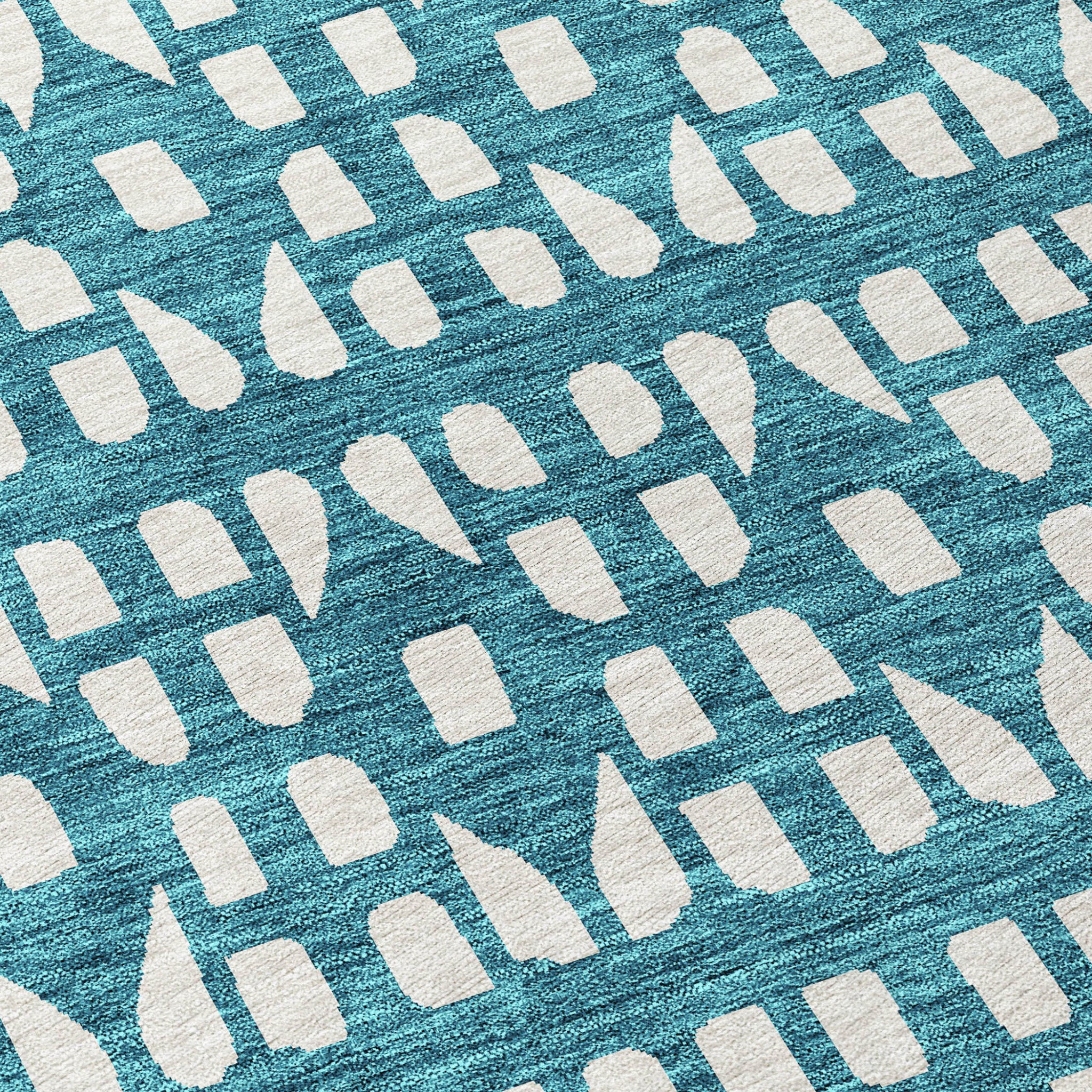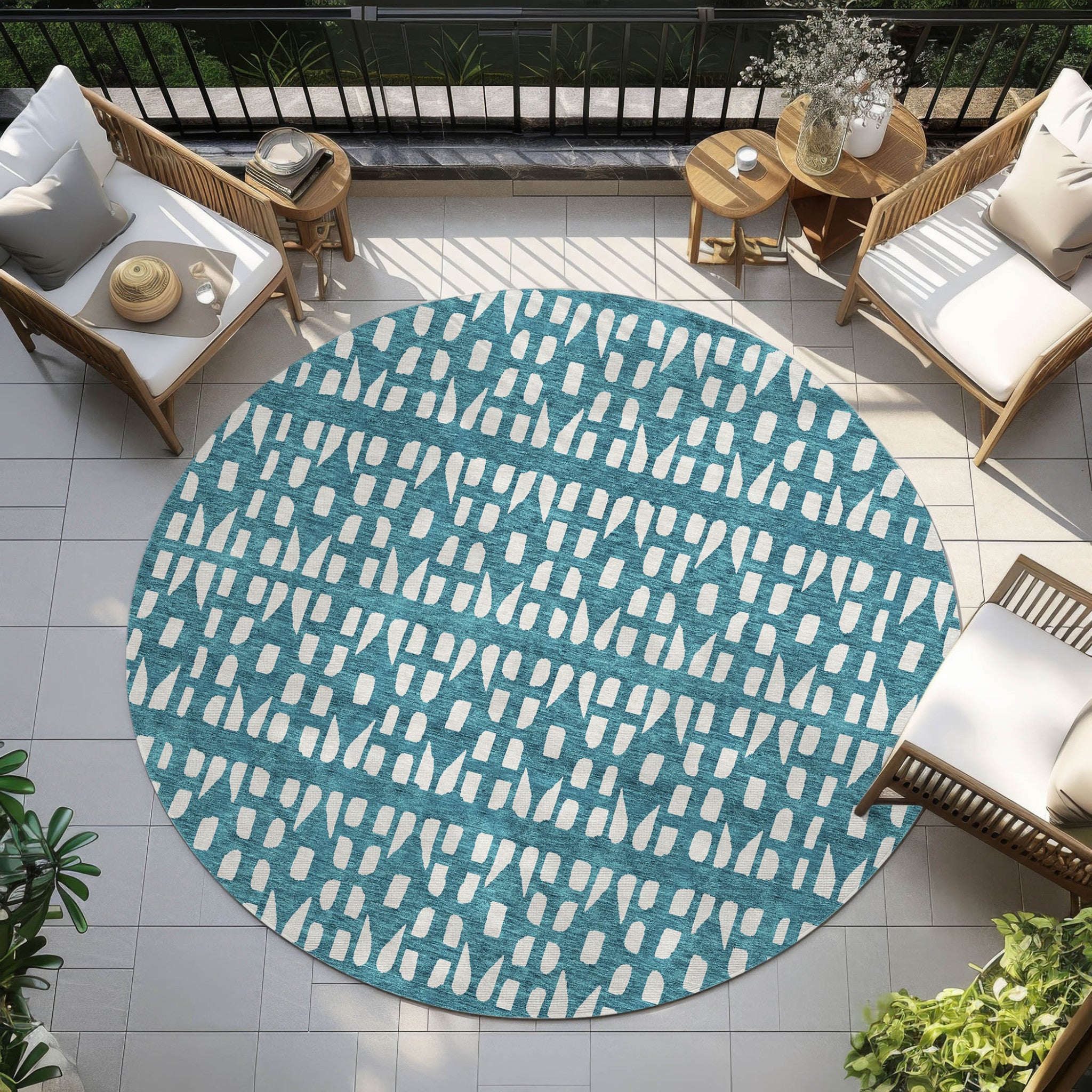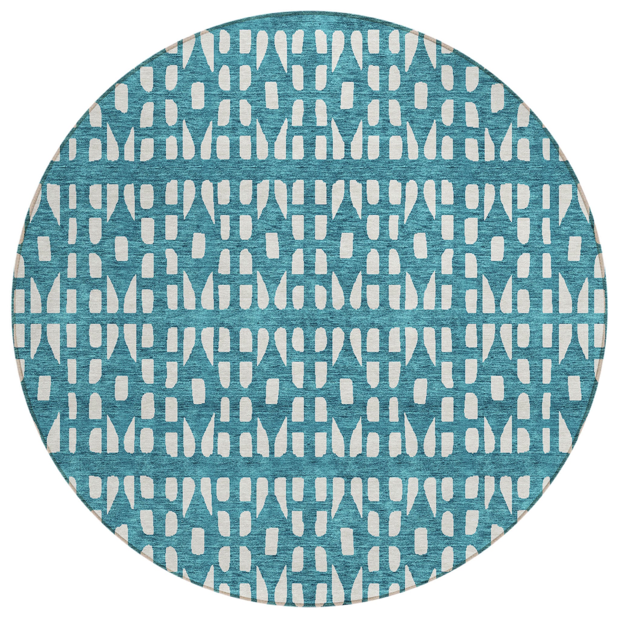 8' Teal Blue And Ivory Round Geometric Washable Indoor Outdoor Area Rug