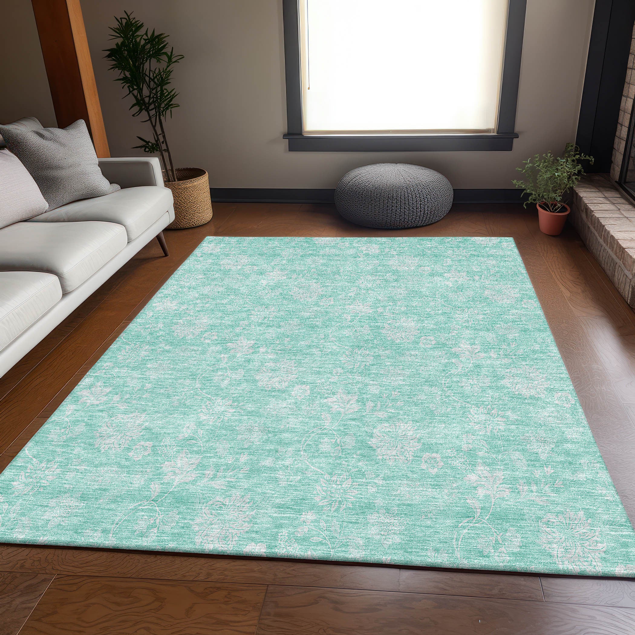 3' X 5' Aqua And Ivory Floral Washable Area Rug With UV Protection