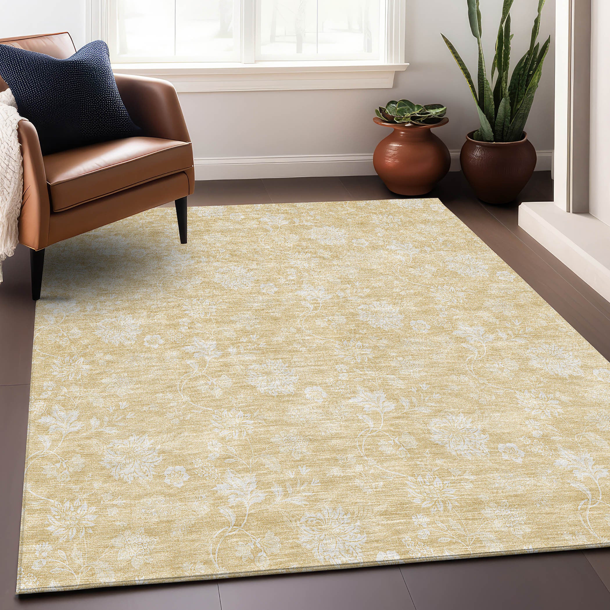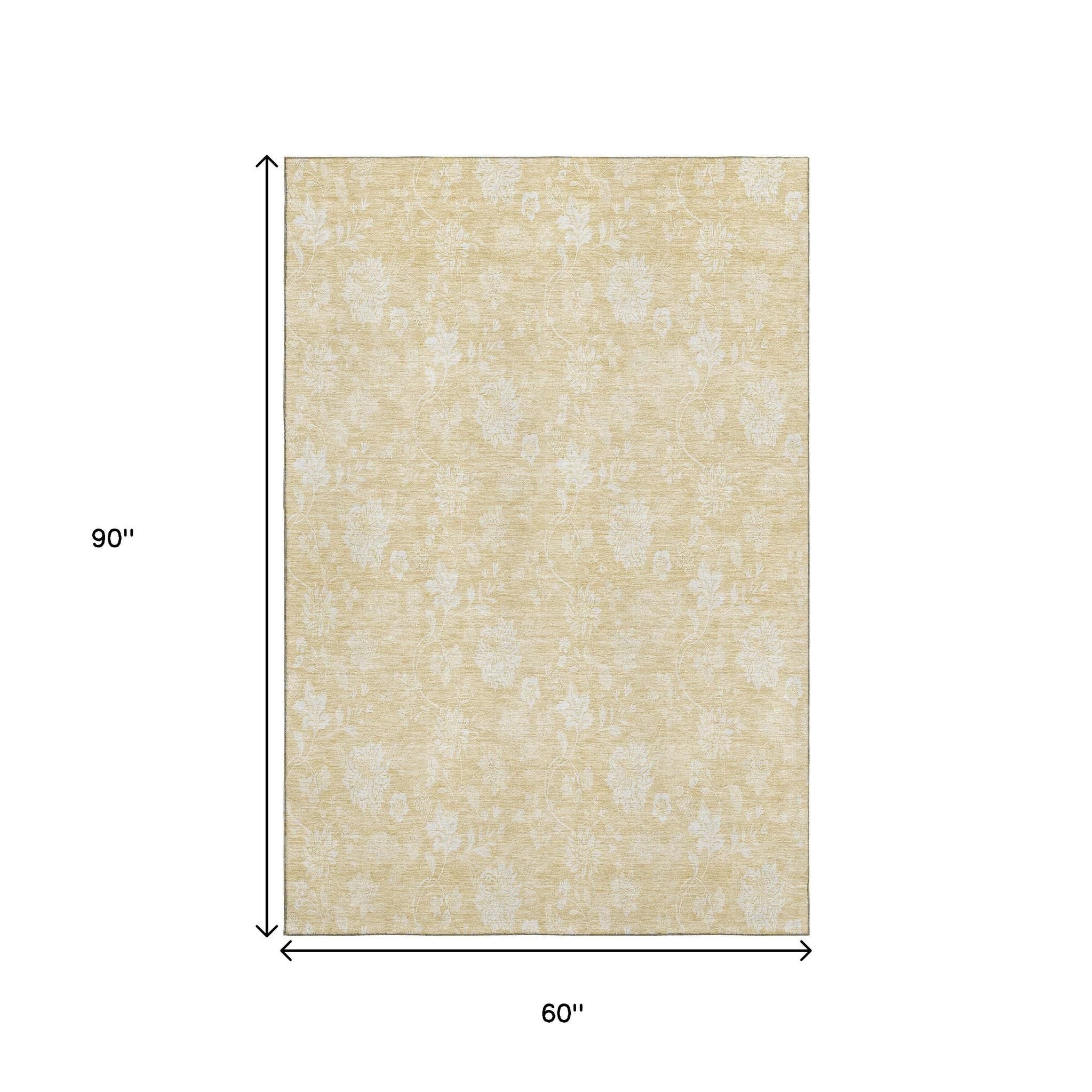 5' X 8' Amber And Ivory Floral Washable Area Rug With UV Protection