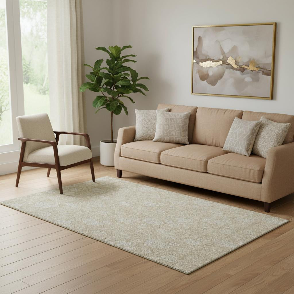 5' X 8' Beige And Ivory Floral Washable Area Rug With UV Protection