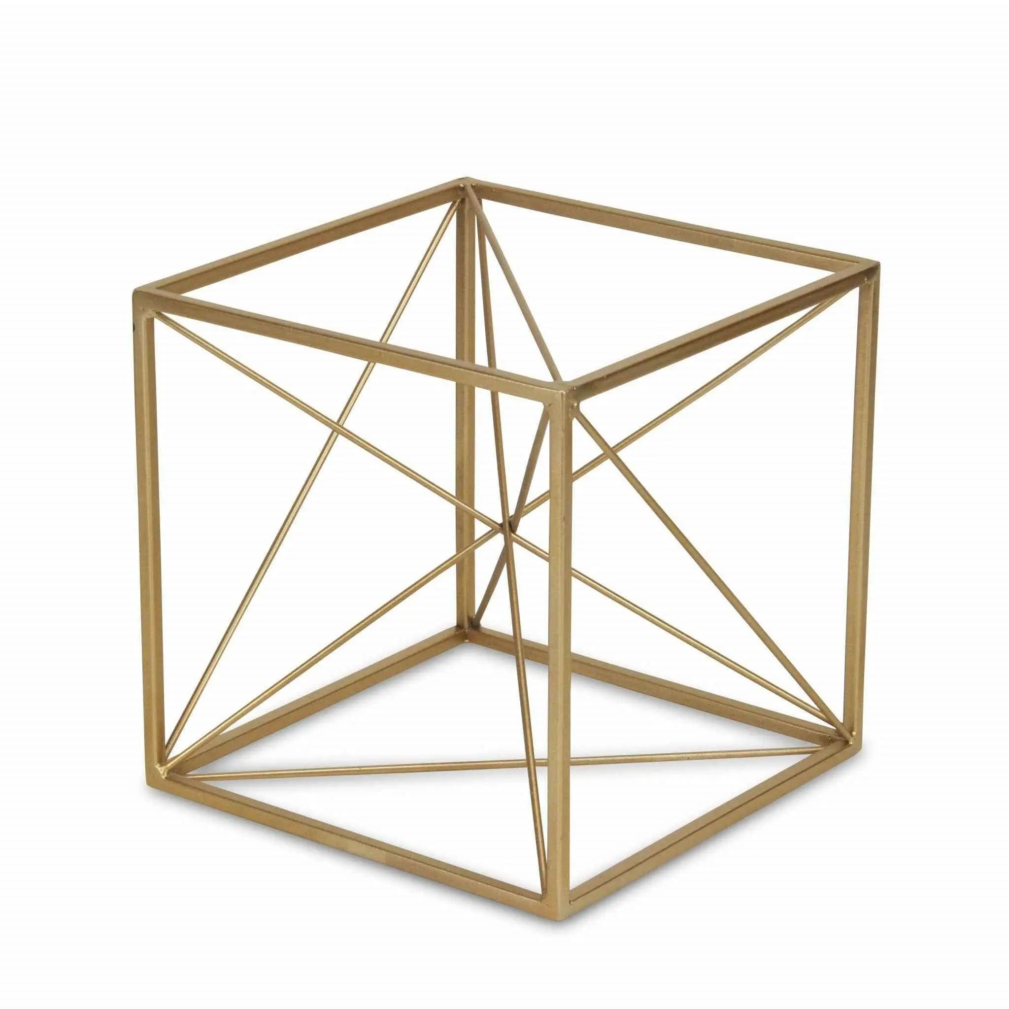 Bring some sizzle to your space with this eye-catching 8" gold metal abstract geo cube sculpture. The gold coloring of this high quality metal modern accent will look great in most any space. Accessorize your room with this chic sculpture in a gold coloration. It's a perfect addition for those who love an up-to-the-minute look and feel. You can be certain that you'll be leaving an impression with this unique piece. 8" H x 8" W x 8" D