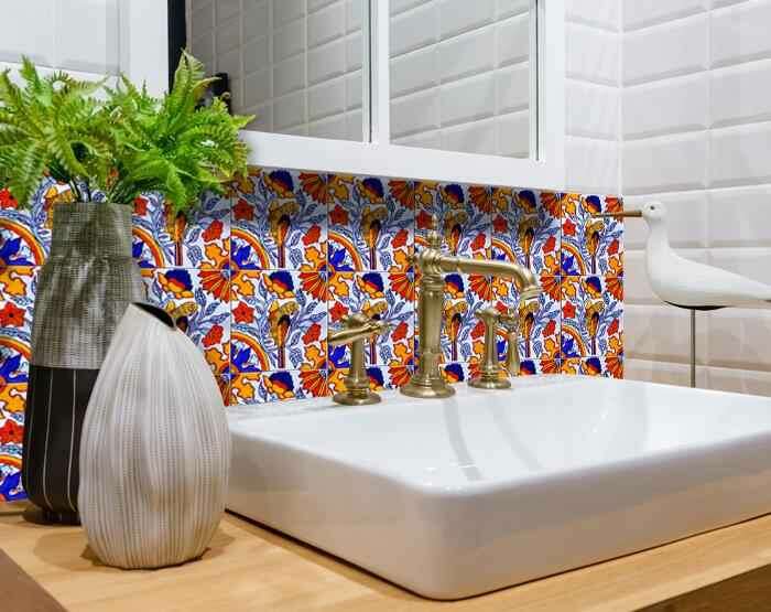 Create a unique look with these 8" x 8" Orange Red and Blue Peel and Stick Removable Tile stickers. These fabulous peel and stick tiles will add sophisticated flair and design to your kitchen backsplash, fireplace mantel, stair treads, half wall, bathroom or nook. These 8" square tile stickers are an easy, no mess solution to complete a personalized and colorful room makeover. Easy to apply on any clean dry flat surface, and easy to remove. Multi use and multi-room appeal make this design option is perfect for renters, landlords, college students and homeowners alike. Peel and stick tile decals make it easy to turn your space into a home. Removable without damage to surfaces. One kit contains 24 stickers. Kit includes a single repeating design.