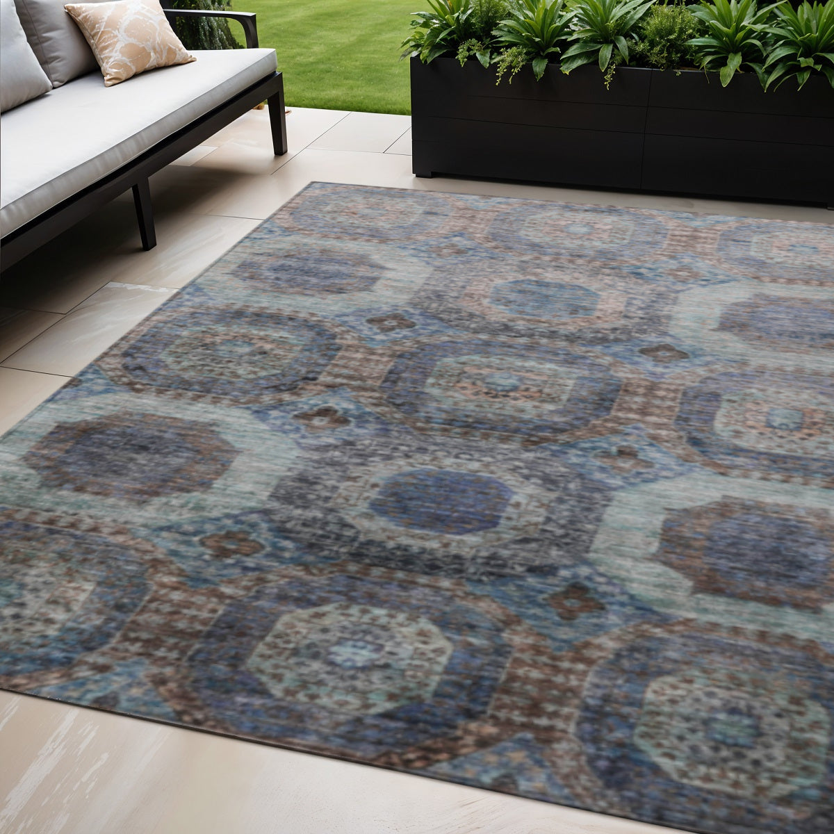Add some artistry to your room with this 5-foot x 8-foot teal blue and copper medallion washable indoor outdoor area rug. This rectangle shaped rug features a medallion design that will work well both indoors or out. A classic shape marries with good looking design for your living room, hall, bedroom, porch, patio, or poolside. Ideal for outdoor spaces or high traffic areas with kids and pets, this rug is made from heavy duty polyester that is stain resistant to help repel water, dirt, and stains. Versatile in use, durable, and easy to maintain, this rug is an ideal solution to add a decorative and inviting touch to your indoor or outdoor space. 60-inch h x 90-inch w x 0.19-inch d.