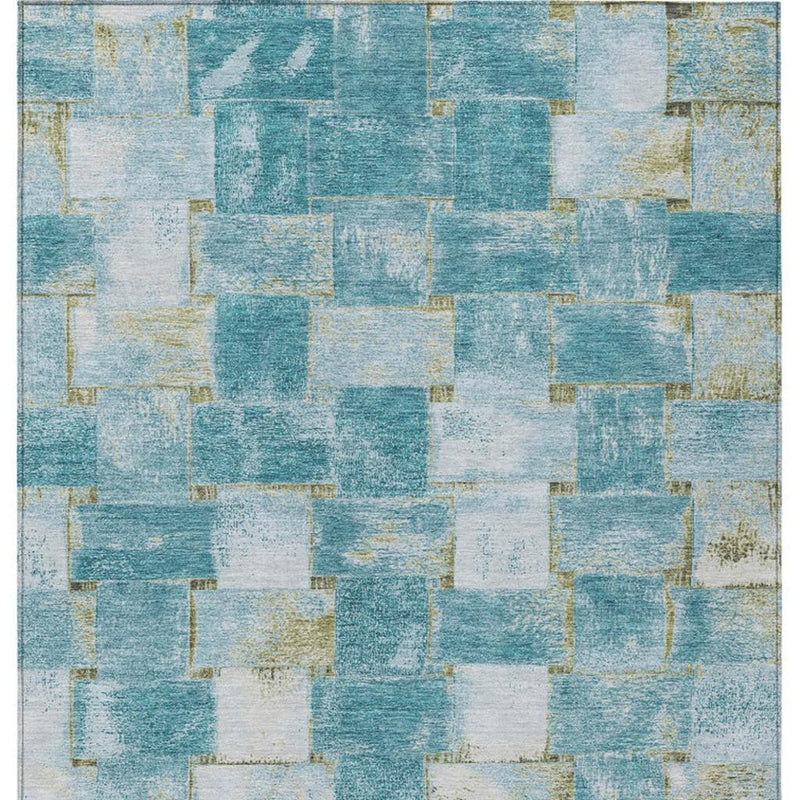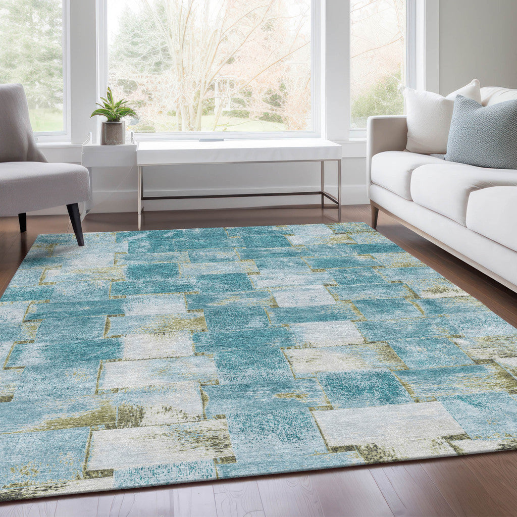 10' X 14' Teal Blue And Khaki Striped Washable Indoor Outdoor Area Rug