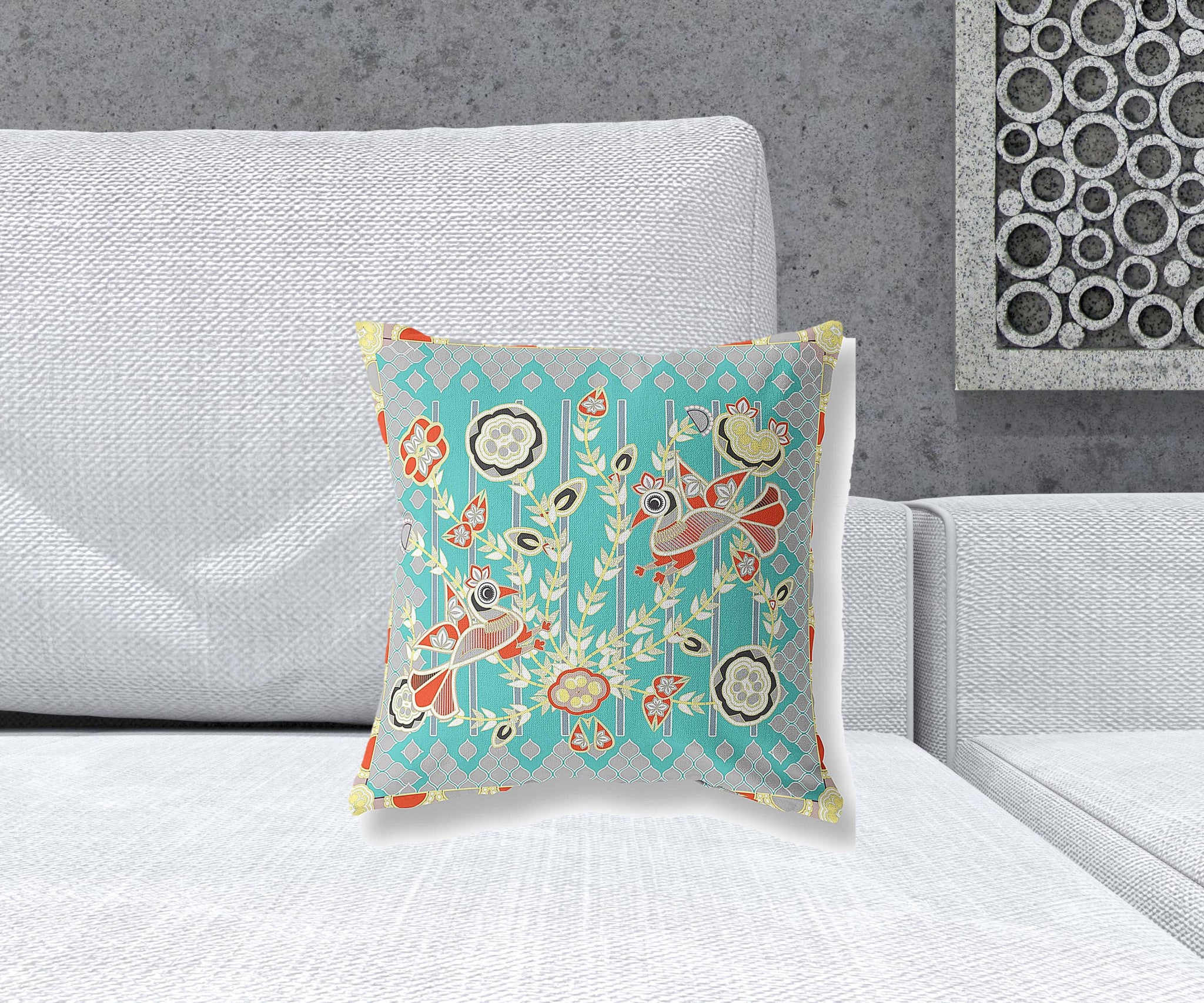 16" x 16" Light Blue Peacock Blown Seam Floral Indoor Outdoor Throw Pillow
