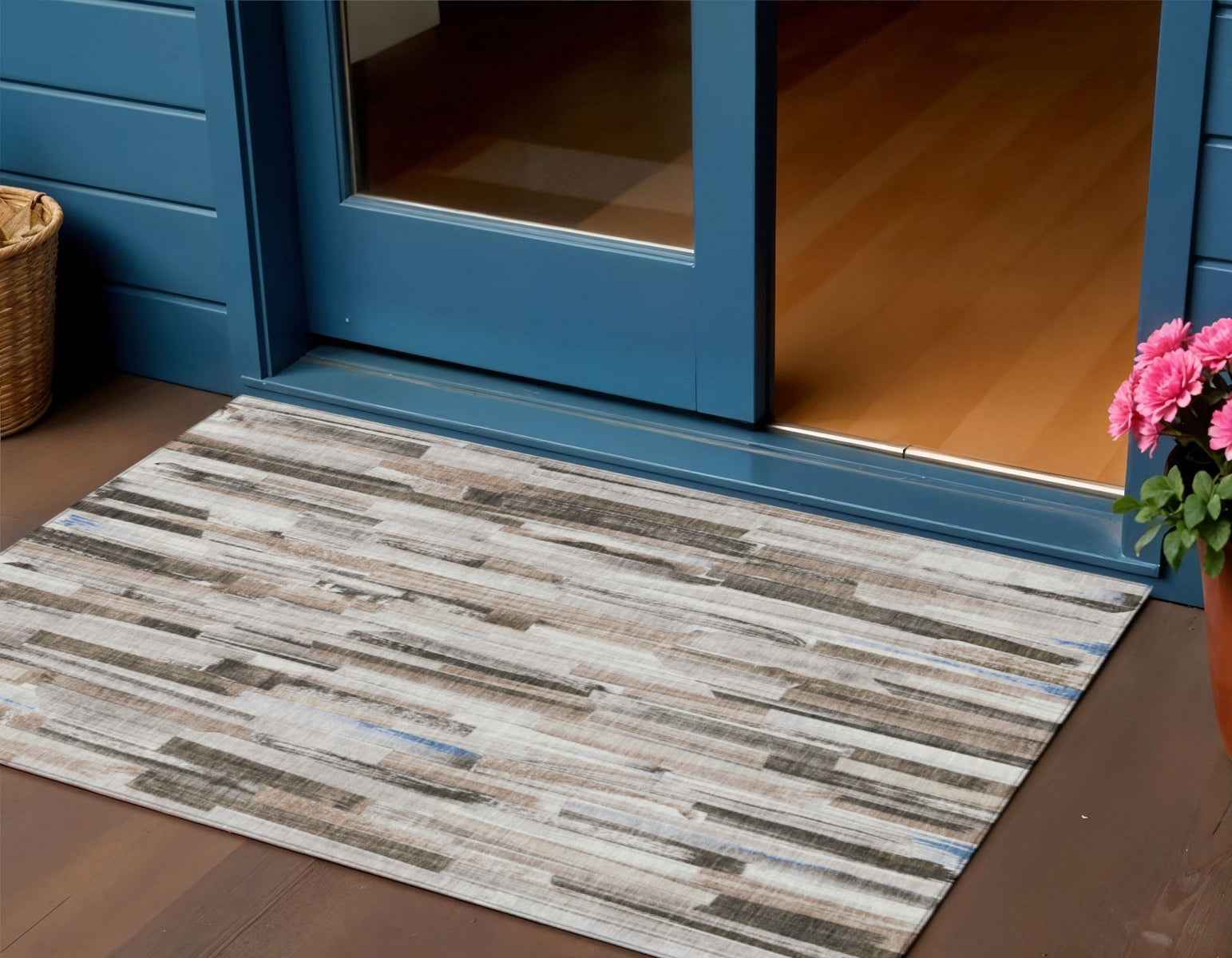 3' X 5' Khaki And Ivory Striped Washable Indoor Outdoor Area Rug
